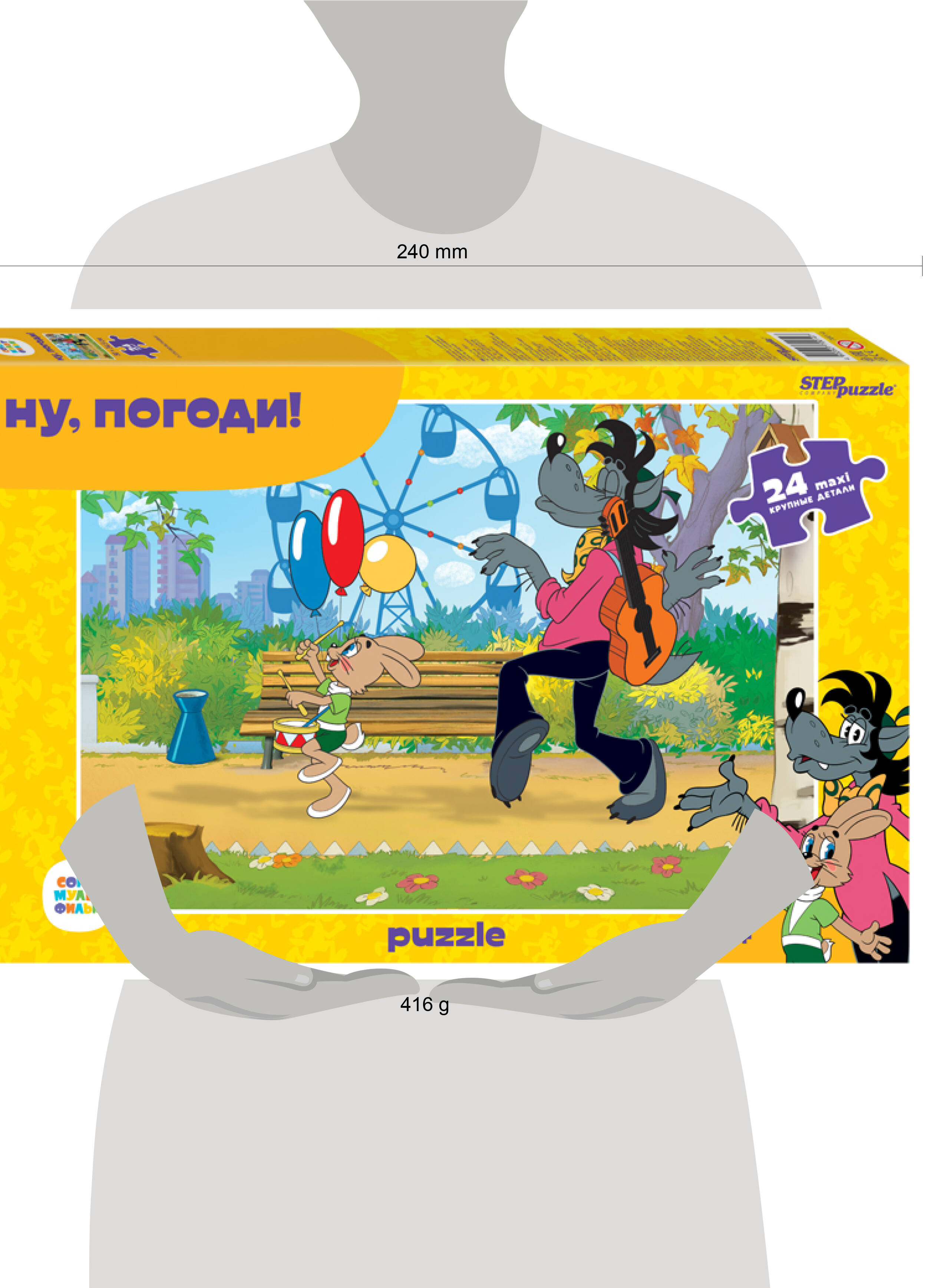 Картинка пазла"Ну, погоди!" возвращает нас к знакомой с детства истории о приключениях Волка и Зайца - в этот раз они отправились гулять по парку аттракционов. Пазл состоит из 24 крупных деталей, размер одного элемента сопоставим с ладонью взрослого человека. Ребенку будет легко с ними играть и составлять картинку, также большие детали будет сложно потерять. Характеристики пазла: - крупные детали пазла (8×8,5 см); - размер собранного изображения - 50*34,5 см; - материал - картон; - качественное изображение; - экологически чистые, нетоксичные материалы (компания Step Puzzle гарантирует высокое качество пазла и точность подгонки). Для кого? Пазл подходит для детей от 3 лет. Яркий и забавный пазл"Ну, погоди!" наверняка понравится детям и даже взрослым. Рекомендуем приобрести специальный клей для пазлов, чтобы скрепить детали мозаики между собой и получить цельную картину.| Издательство | Степ Пазл ЗАО |