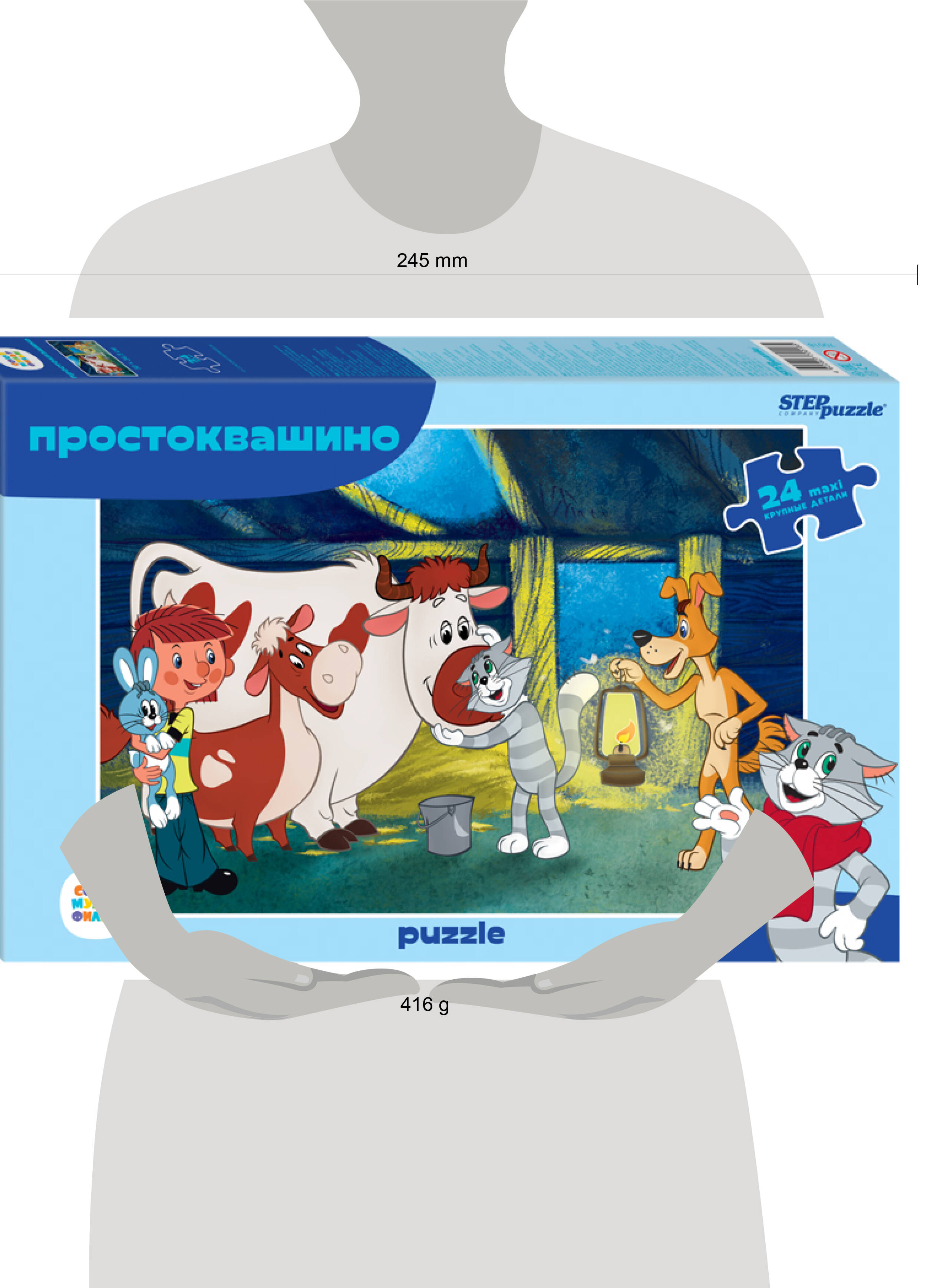 Пазл "Простоквашино" основан на сюжетах знаменитого советского мультфильма. Глядя на картинку, так и хочется сказать: "Ура, у нашей коровы теленок родился!". Пазл состоит из 24 крупных деталей, размер одного элемента сопоставим с ладонью взрослого человека. Ребенку будет легко с ними играть и составлять картинку, также большие детали будет сложно потерять.| Издательство | Степ Пазл ЗАО |