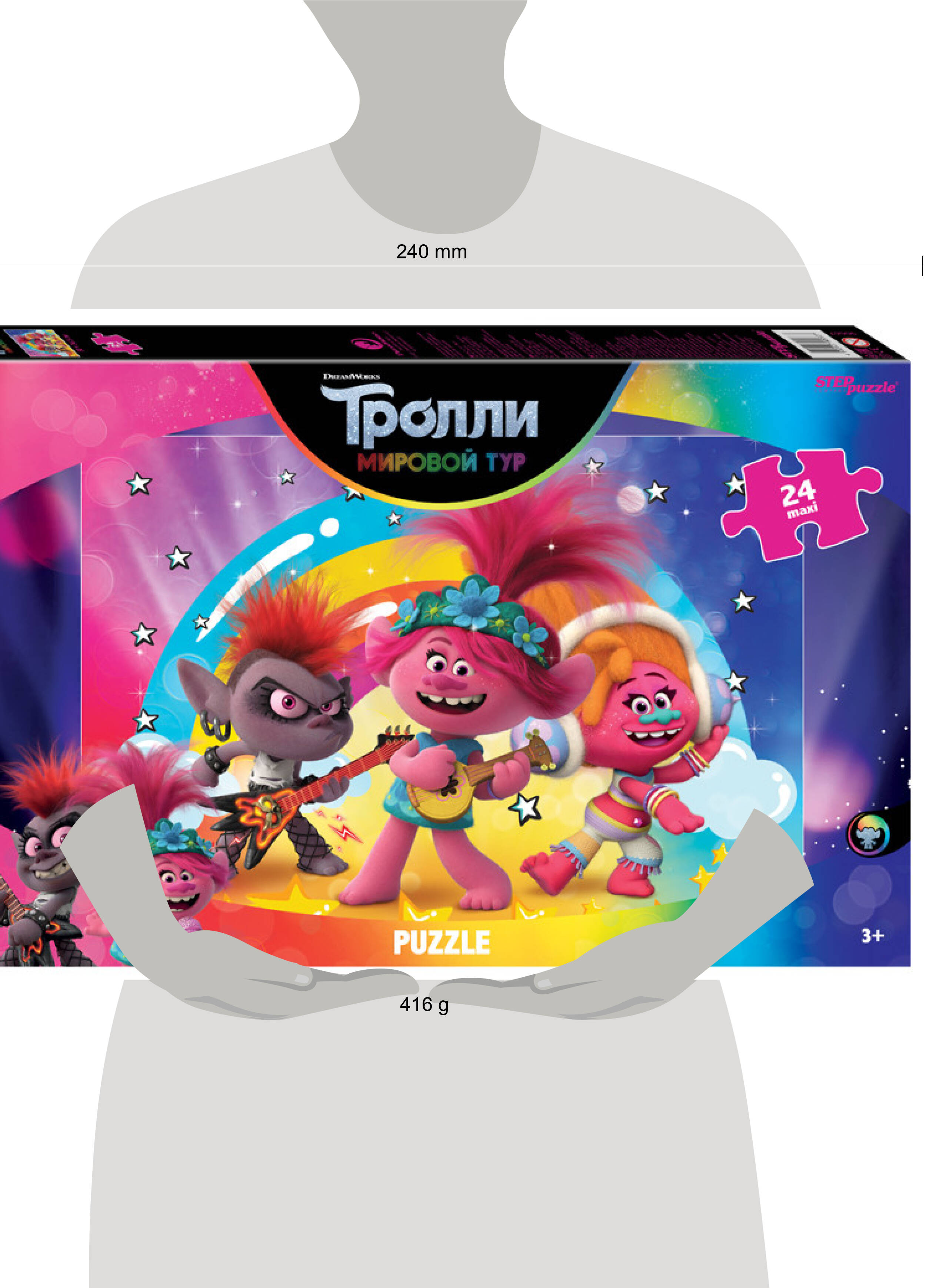 Пазл "Trolls - 2. POP Life" основан на второй части любимого мультфильма от корпорации DreamWorks. На его картинке мы видим главных героев истории - Розочку, Королеву Рокс и диджея Звуки. Пазл состоит из 24 крупных деталей, размер одного элемента сопоставим с ладонью взрослого человека. Ребенку будет легко с ними играть и составлять картинку, также большие детали будет сложно потерять. Характеристики пазла: - крупные детали пазла (8×8,5 см); - размер собранного изображения - 50*34,5 см; - материал - картон; - качественное изображение; - экологически чистые, нетоксичные материалы (компания Step Puzzle гарантирует высокое качество пазла и точность подгонки). Для кого? Пазл подходит для детей от 3 лет. Яркий пазл "Trolls - 2. POP Life" наверняка понравится любителям этого яркого музыкального приключения. А потом и сам мультик можно посмотреть. Рекомендуем приобрести специальный клей для пазлов, чтобы скрепить детали мозаики между собой и получить цельную картину.