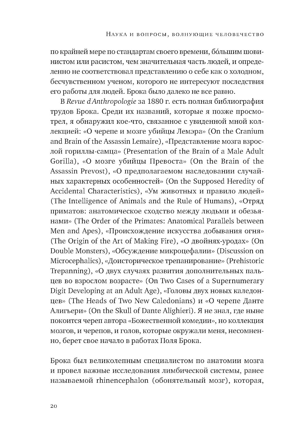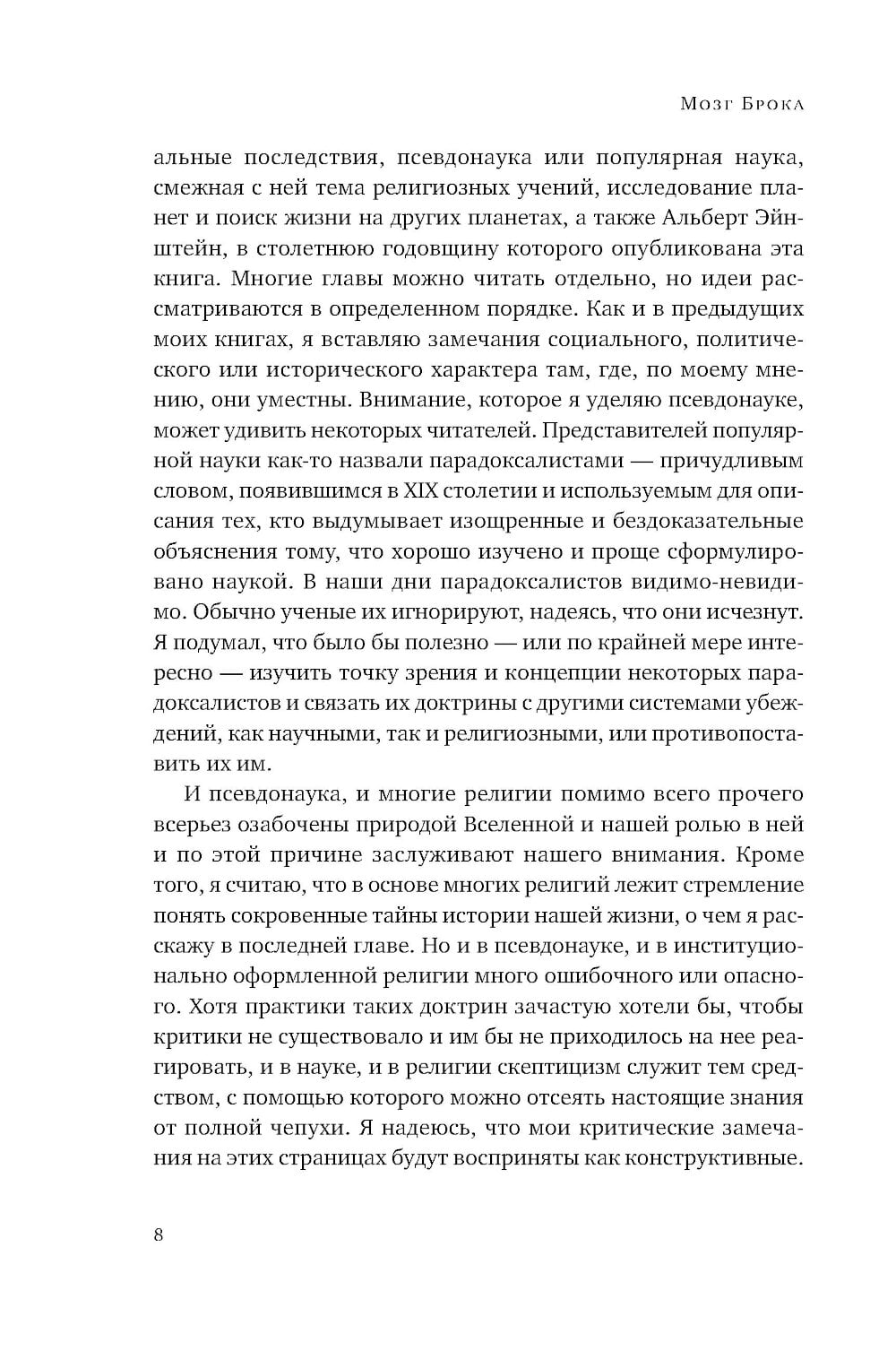 Книга «Мозг Брока» - глубокий и поэтичный рассказ выдающегося астронома и астрофизика о романтике и ответственности, рисках и перспективах науки. Какое место она занимает в жизни человечества и чем отличается от псевдонауки? Откуда взялись мифы об Атлантиде, Бермудском треугольнике, древних астронавтах и эмоциях у растений и почему важно их развенчивать? Какие планеты и спутники Солнечной системы могут быть пригодны для колонизации, как зародилась жизнь и где в далеком космосе она возможна еще? Как планетам и галактикам даются имена и какие ошибки делали великие ученые за долгие годы стремления к истине? Как наука может объяснить околосмертный опыт и как это, вероятно, связано с опытом рождения? Как религия соотносится с наукой? Каково будущее искусственного интеллекта и космических исследований? На все эти размышления Карла Сагана натолкнул визит в парижский Музей человека. В частности, его потрясла коллекция Поля Брока, где находится и мозг самого Брока - великого антрополога, особенно знаменитого открытием в мозге человека области, отвечающей за членораздельную речь. При всей масштабности и информативности книги авторское мастерство и присущая только Сагану интонация делают ее чтение доступным и радостным для самого широкого читателя.| Издательство | Альпина нон-фикшн |