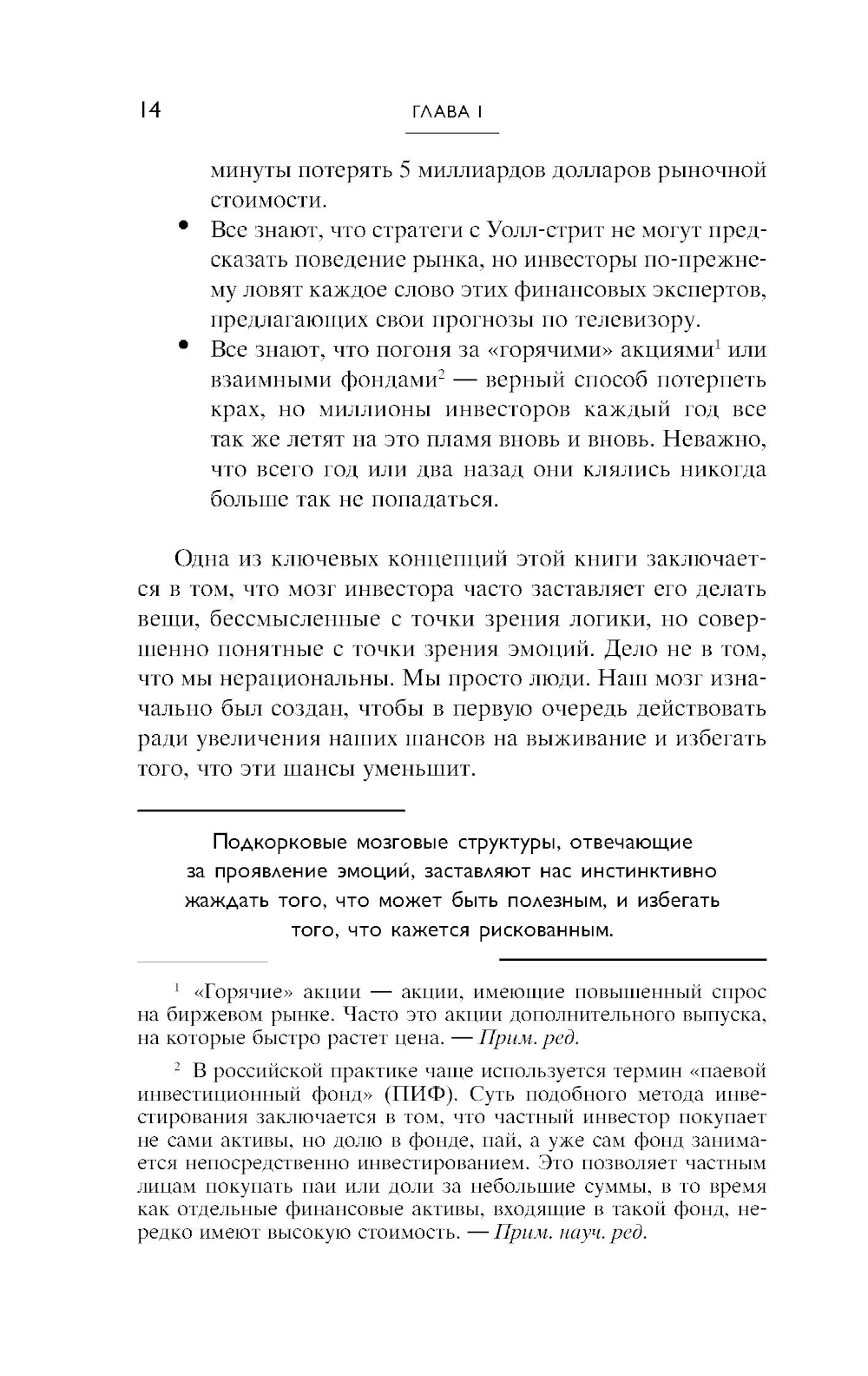 Люди ежедневно принимают финансовые решения. Берут ипотеку, меняют доллары на иены, запасаются гречкой, инвестируют в акции и криптовалюту - чтобы получать выгоду. Миллиарды нейронов в голове homo economicuc работают над этой целью. Они управляют деньгами, но не всегда сохраняют и приумножают. Почему? Чтобы ответить на этот вопрос, Джейсон Цвейг, редактор вечного бестселлера «Разумный инвестор» отправился в ведущие нейробиологические лаборатории и подверг себя множеству научных экспериментов. В этой книге он объясняет, в какие игры играет разум с деньгами, существует ли алгоритм успешного финансового поведения. И если да, то как его найти и, наконец, разбогатеть.| Издательство | Эксмо |