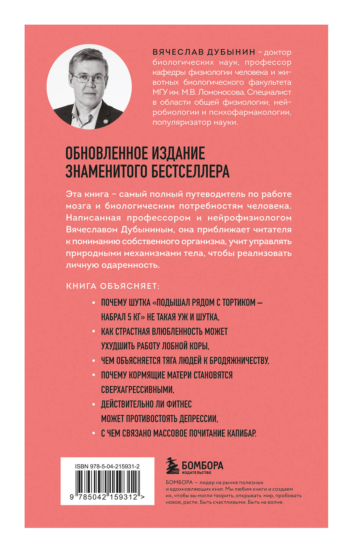 ОБНОВЛЕННОЕ ИЗДАНИЕ ЗНАМЕНИТОГО БЕСТСЕЛЛЕРА. Эта книга - самый полный путеводитель по работе мозга и биологическим потребностям человека. Написанная профессором, доктором биологических наук Вячеславом Дубыниным, она приближает читателя к пониманию собственного организма, учит управлять природными механизмами тела, чтобы реализовать личную одаренность. КНИГА ОБЪЯСНЯЕТ: - Почему шутка «Подышал рядом с тортиком - набрал 5 кг» не такая уж и шутка. - Как страстная влюбленность может ухудшить работу лобной коры. - Чем объясняется тяга людей к бродяжничеству. - Почему кормящие матери становятся сверхагрессивными. - Действительно ли фитнес может противостоять депрессии. - С чем связано массовое почитание капибар.| Издательство | ООО "Издательство "Эксмо" |