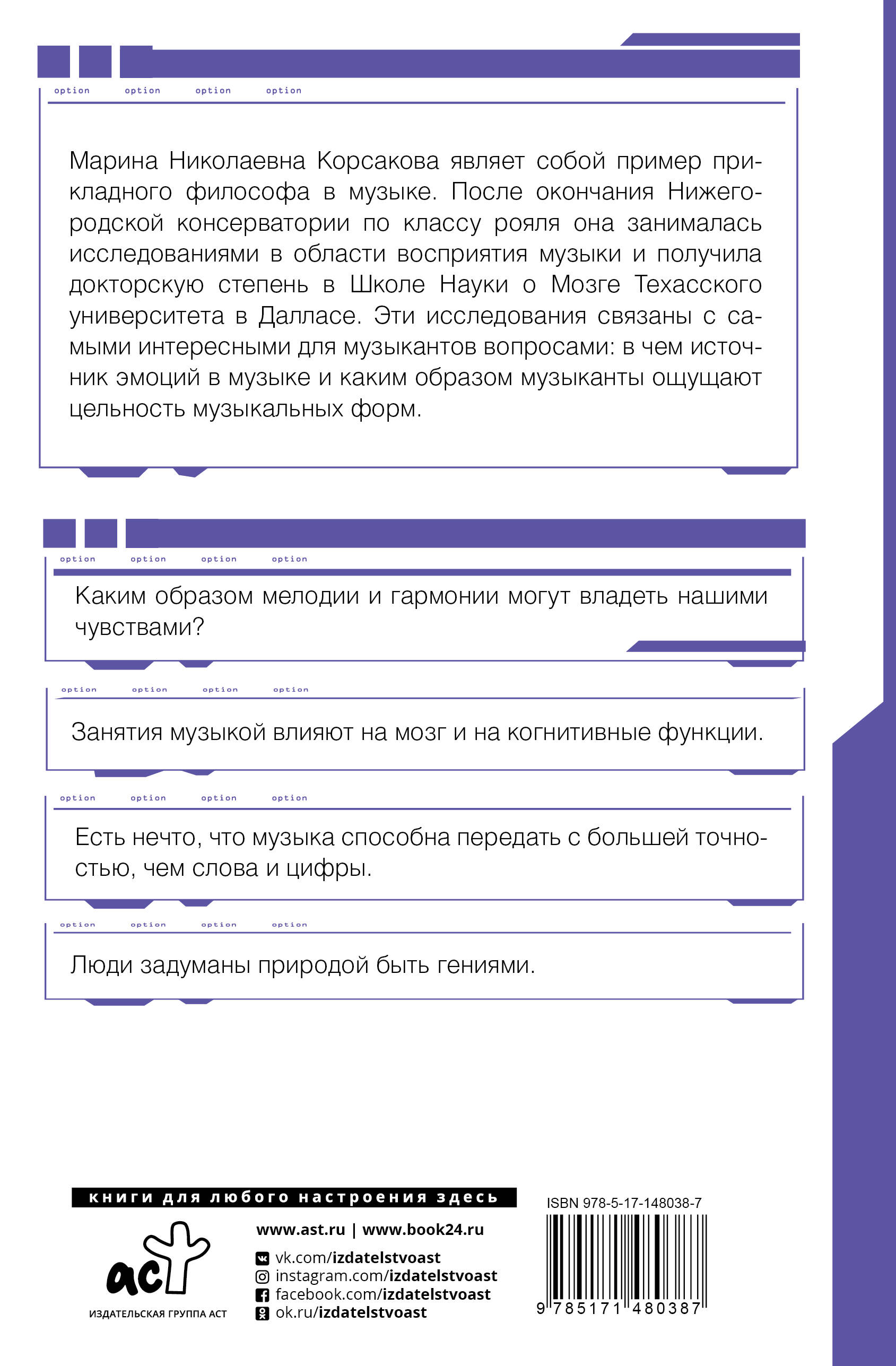 Книга преподавателя музыки и нейропсихолога Марины Корсаковой «Мозг и музыка. Как чувства проявляют себя в музыке и почему ее понимание доступно всем» посвящена тому, как мелодии кодируют нашу жизнь, влияют на настроение, формируют сознание, и рассказывает о новейших исследованиях влияния музыки на мозг человека. В чем отличие мозга музыкантов от не-музыкантов? Почему мажорная мелодия кажется нам веселой? Как гармония звуков вызывает у нас эмоции и меняет настроение? Марина Корсакова отвечает на эти и множество других интересных вопросов, связанных с музыкой, на страницах своей книги.| Издательство | АСТ |