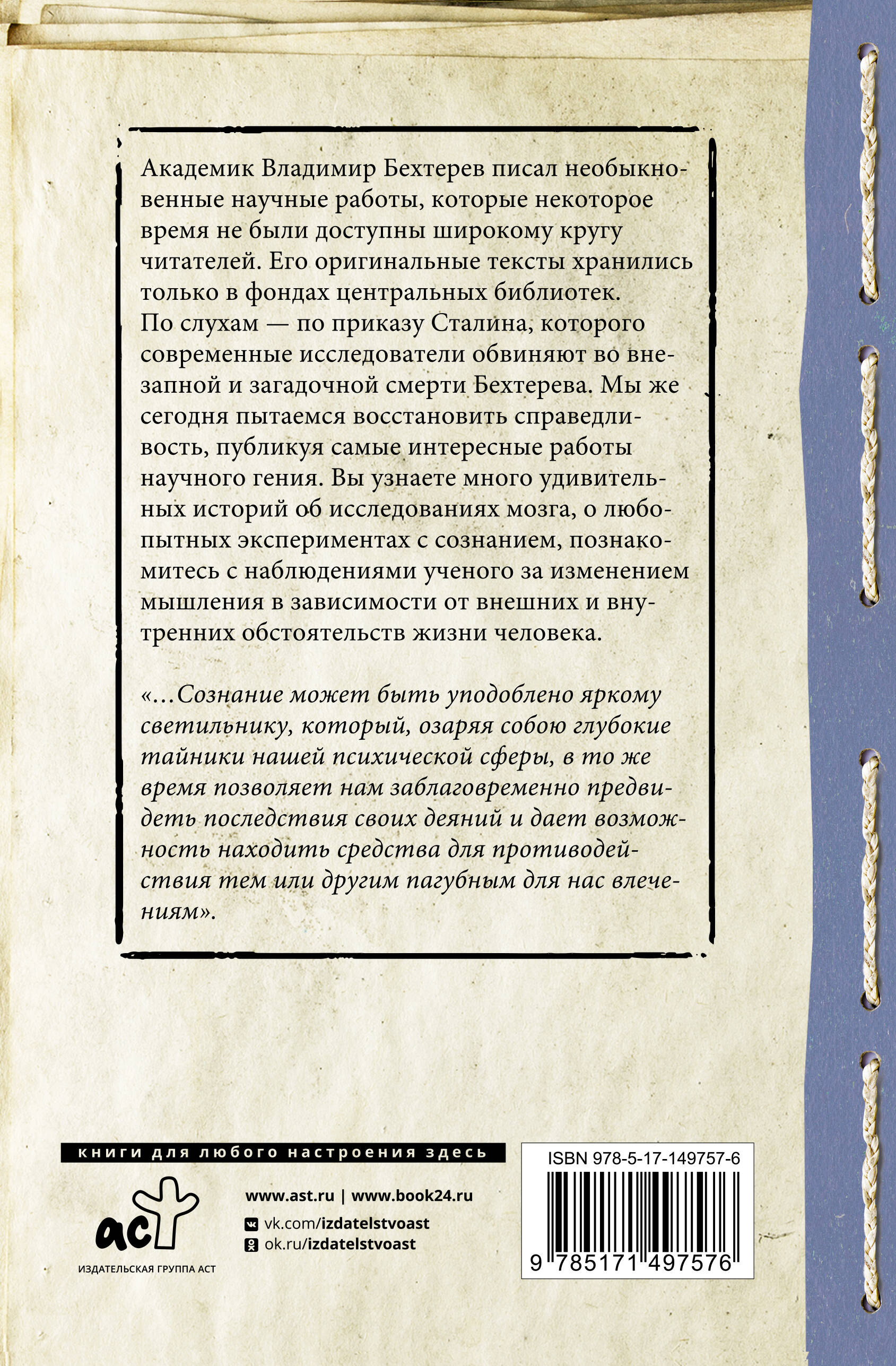 В книгу вошли выдержки из разных произведений Владимира Бехтерева: «Внушение и его роль в общественной жизни», «Сознание и его границы» и других. Читатели познакомятся с основными принципами работы нашего мозга и сделают удивительные открытия в области нейробиологии. Автор объясняет сложные термины простым языком и излагает материал максимально увлекательно. Книга будет интересна всем, кто интересуется наукой и, в особенности, работой человеческого мозга.| Издательство | АСТ |