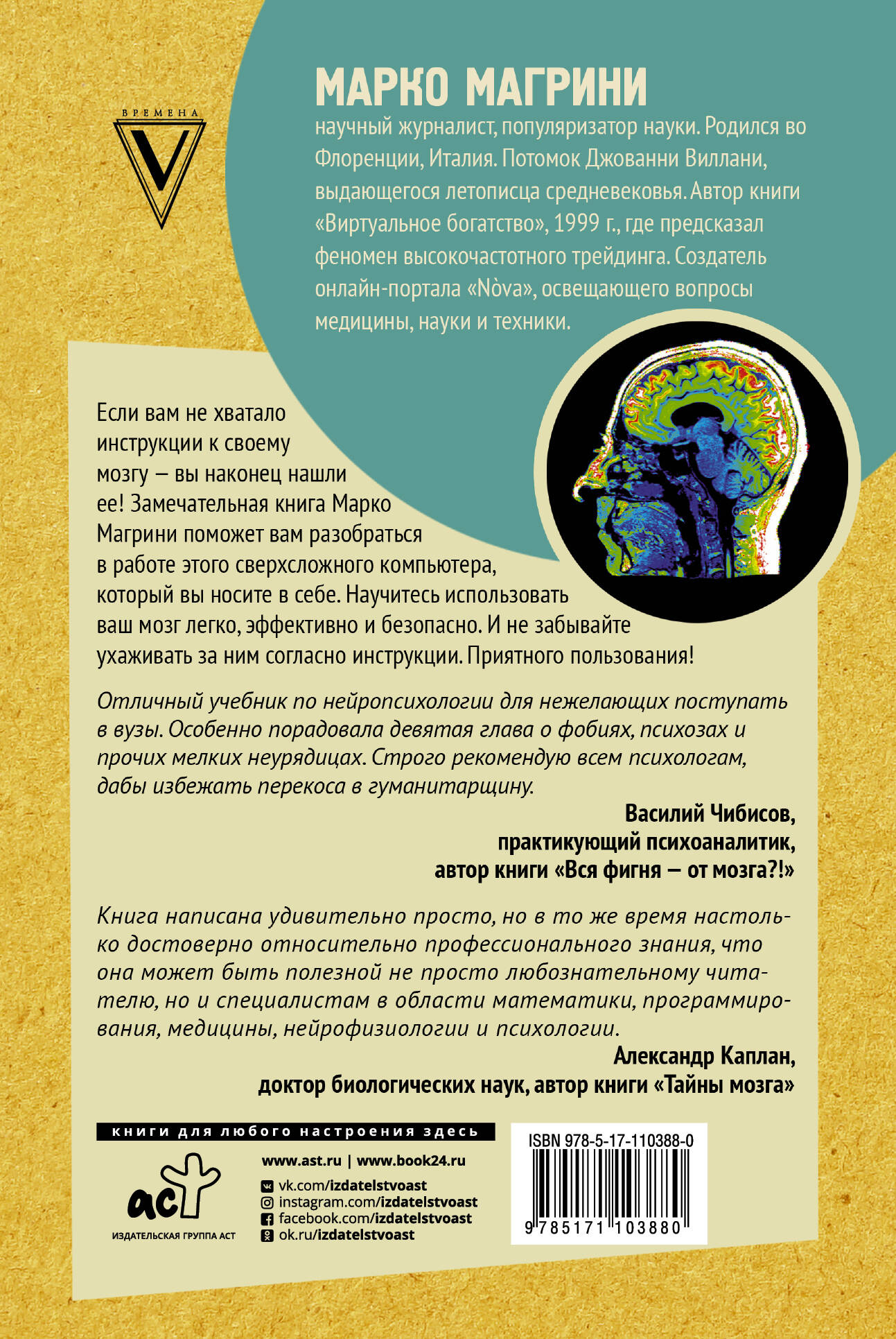 Марко Магрини - научный журналист, популяризатор науки. Родился во Флоренции, Италия. По собственному утверждению, потомок Джованни Виллани, выдающегося летописца средневековья. Автор книги "Виртуальное богатство" ("La Ricchezza Digitale"), 1999 г., где предсказал феномен высокочастотного трейдинга. Создатель онлайн-портала "Nòva", освещающего вопросы медицины, науки и техники. Если вам не хватало инструкции к своему мозгу - вы наконец нашли ее! Замечательная книга Марко Магрини поможет вам разобраться в работе этого сверхсложного компьютера, который вы носите в себе. Научитесь использовать ваш мозг легко, эффективно и безопасно. И не забывайте ухаживать за ним согласно инструкции. Приятного пользования! Отличный учебник по нейропсихологии для нежелающих поступать в вузы. Особенно порадовала девятая глава о фобиях, психозах и прочих мелких неурядицах. Строго рекомендую всем психологам, дабы избежать перекоса в гуманитарщину. Василий Чибисов, практикующий психоаналитик, автор книги «Вся фигня - от мозга?!» Книга написана удивительно просто, но в тоже время настолько достоверно относительно профессионального знания, что она может быть полезной не просто любознательному читателю, но и специалистам в области математики, программирования, медицины, нейрофизиологии и психологии. Александр Каплан, доктор биологических наук, автор книги «Тайны мозга»| Издательство | Издательство "АСТ" |