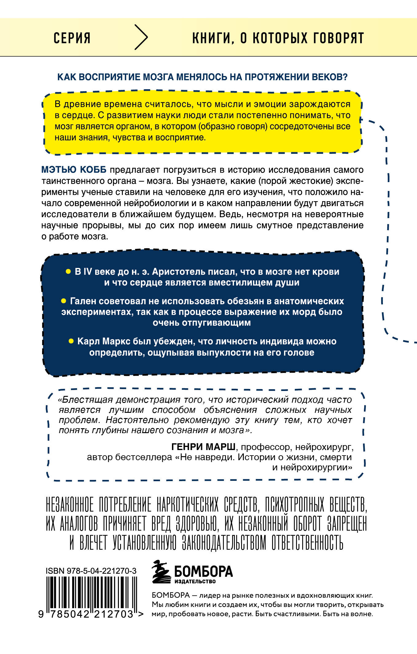 Как менялось наше представление о мозге с древних времен? Если сегодня мозг иногда называют суперкомпьютером, то раньше его сравнивали с часами, телеграфом, телефоном и гидравлическими системами. Профессор Мэтью Кобб описывает невероятные открытия, сделанные в попытках определить функции мозга, а также гениальные и шокирующие эксперименты, которые к ним привели. - Мозг - это орган, который эволюционирует более 500 миллионов лет. - После вскрытия невозможно определить, является ли мозг мужским или женским. - Телеграф раньше являлся моделью для описания того, как работает мозг человека. - Электричество в прошлом использовали для лечения различных видов паралича. «Блестящая демонстрация того, что исторический подход часто является лучшим способом объяснения сложных научных проблем. Настоятельно рекомендую эту книгу тем, кто хочет понять глубины нашего сознания и мозга». - ГЕНРИ МАРШ, профессор, нейрохирург, автор бестселлера «Не навреди. Истории о жизни, смерти и нейрохирургии» «Труд известного популяризатора науки Мэтью Кобба читается на одном дыхании. Он описывает все этапы изучения мозга с древних времен, а также неудачные попытки найти место, где спрятано наше сознание. Перед нами предстанут великие ученые и их открытия, а в завершение автор раскроет возможные пути развития мозга и новых технологий». - МИХАИЛ ТАРДОВ, д. м. н., невролог, ведущий сотрудник ГБУЗ НИКИО им. Л.И. Свержевского ДЗМ| Издательство | ООО "Издательство "Эксмо" |