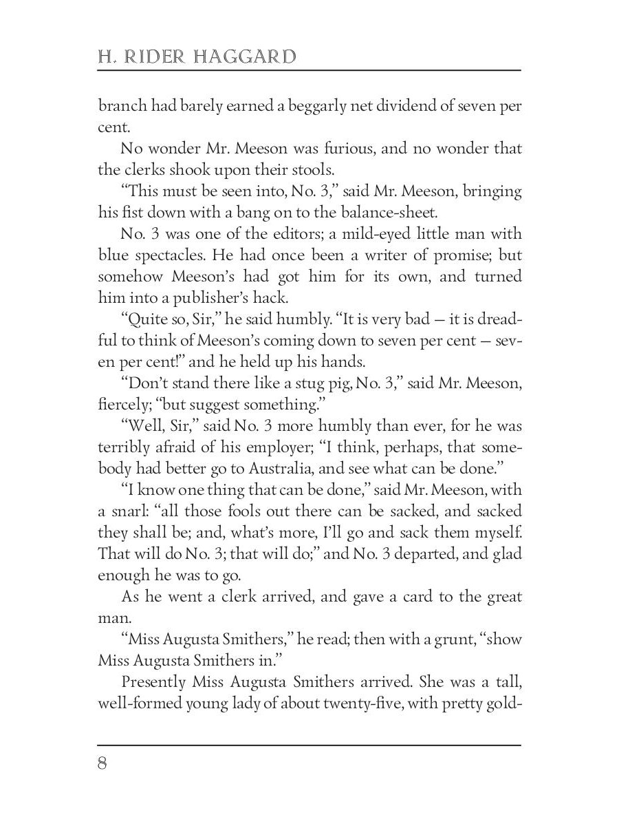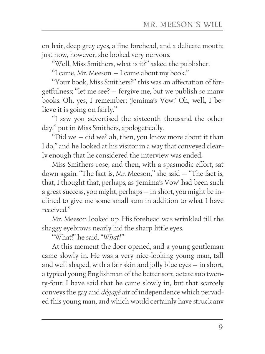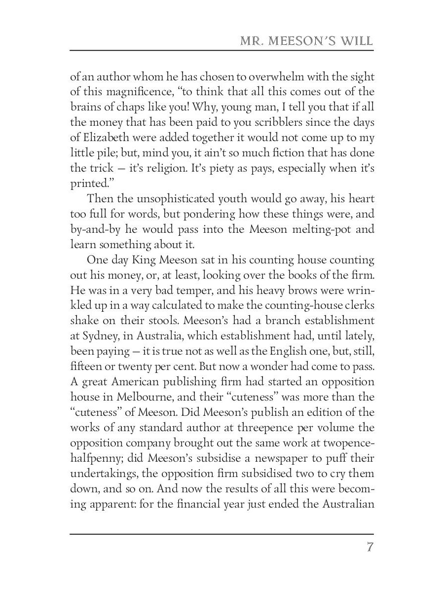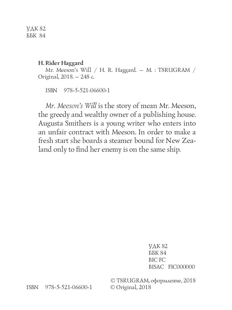 Mr. Meeson's Will is the story of mean Mr. Meeson, the greedy and wealthy owner of a publishing house. Augusta Smithers is a young writer who enters into an unfair contract with Meeson. In order to make a fresh start she boards a steamer bound for New Zealand only to find her enemy is on the same ship.| Издательство | Т8 RUGRAM |
