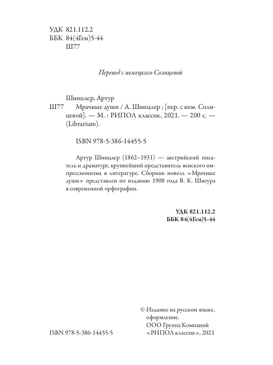 Артур Шницлер (1862-1931) - австрийский писатель и драматург, крупнейший представитель венского импрессионизма в литературе. Идеи Зигмунда Фрейда сильно повлияли на творчество писателя. Поэтому читатель наблюдает за внутренними монологами, за снами, тайными желаниями, мечтами героев. В калейдоскопе новелл «Мрачные души» все закованы в декорации буржуазных городов, их прекрасные фасады. Однако действующие лица лишены понимания своей жизни и жизни своих возлюбленных. Герои будто отчуждены в обществе, их личности распадаются и исчезают. Ни утонченные манеры, ни достаток, ни образование не помогают обрести счастья.| Издательство | Рипол Классик |