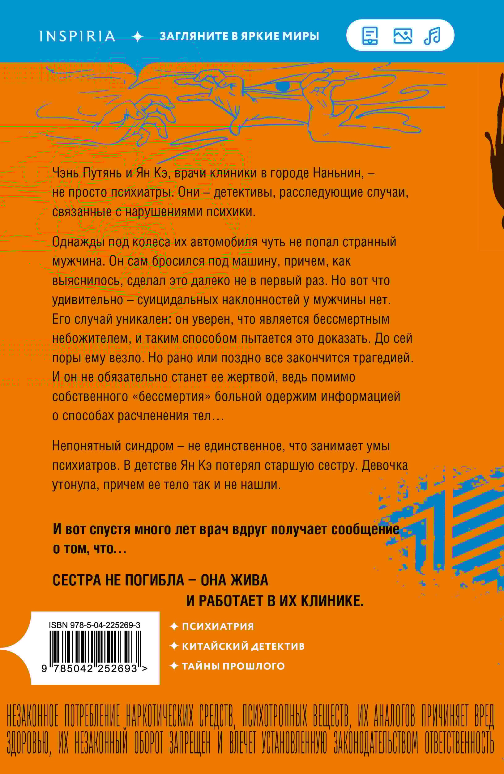 НЕЗАКОННОЕ ПОТРЕБЛЕНИЕ НАРКОТИЧЕСКИХ СРЕДСТВ, ПСИХОТРОПНЫХ ВЕЩЕСТВ, ИХ АНАЛОГОВ ПРИЧИНЯЕТ ВРЕД ЗДОРОВЬЮ, ИХ НЕЗАКОННЫЙ ОБОРОТ ЗАПРЕЩЕН И ВЛЕЧЕТ УСТАНОВЛЕННУЮ ЗАКОНОДАТЕЛЬСТВОМ ОТВЕТСТВЕННОСТЬ. ВСЕ СЛУЧАИ ПСИХИАТРИЧЕСКИХ ЗАБОЛЕВАНИЙ, ОПИСАННЫЕ ЗДЕСЬ, ОСНОВАНЫ НА РЕАЛЬНЫХ СОБЫТИЯХ. Вы скажете, что такого не может быть. А я отвечу вам: может быть все. Потому что виной всему этому стал человеческий разум. И человеческое безумие… Чэнь Путянь и Ян Кэ, врачи клиники в городе Наньинь, - не просто психиатры. Они - детективы, расследующие случаи, связанные с нарушениями психики. Однажды под колеса их автомобиля чуть не попал странный мужчина. Он сам бросился под машину, причем, как выяснилось, сделал это далеко не в первый раз. Но вот что удивительно - суицидальных наклонностей у мужчины нет. Его случай уникален: он уверен, что является бессмертным небожителем, и таким способом пытается это доказать. До сей поры ему везло. Но рано или поздно все закончится трагедией. И он не обязательно станет ее жертвой, ведь помимо собственного «бессмертия» больной одержим информацией о способах расчленения тел… Непонятный синдром - не единственное, что занимает умы психиатров. В детстве Ян Кэ потерял старшую сестру. Девочка утонула, причем ее тело так и не нашли. И вот спустя много лет врач вдруг получает сообщение о том, что… СЕСТРА НЕ ПОГИБЛА - ОНА ЖИВА И РАБОТАЕТ В ИХ КЛИНИКЕ.| Издательство | ООО "Издательство "Эксмо" |