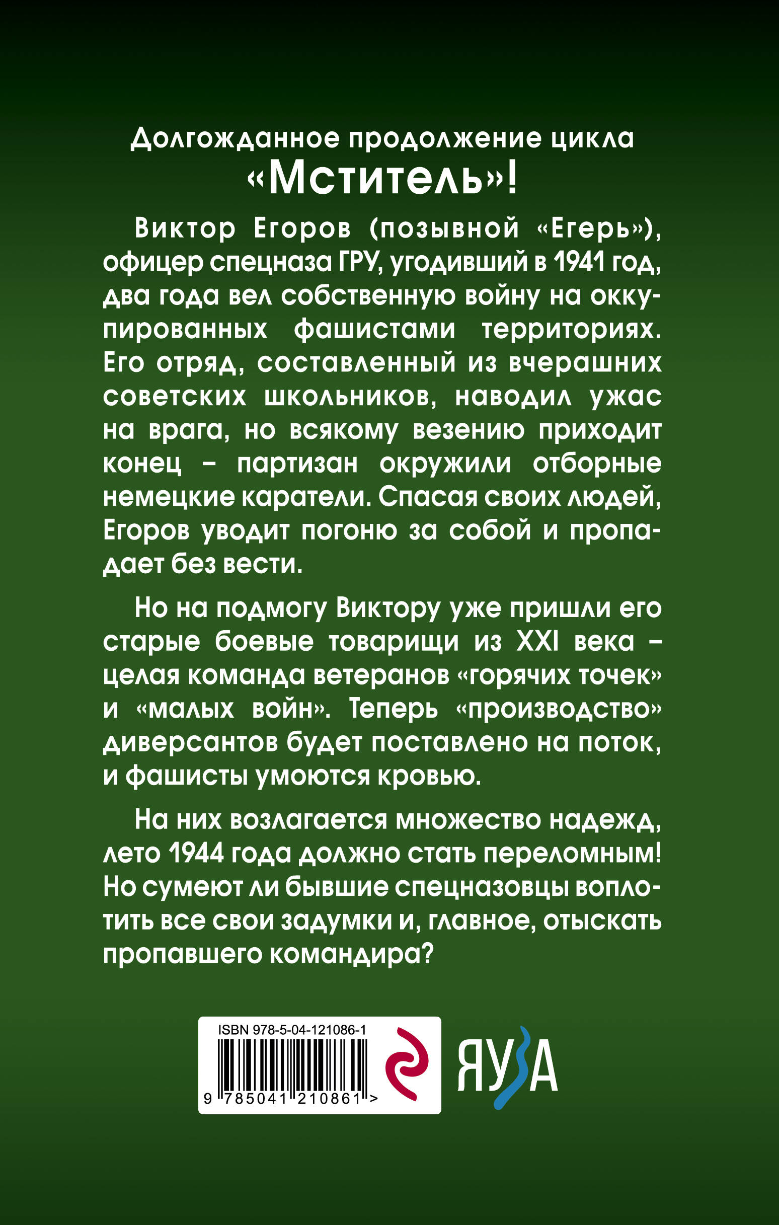 Долгожданное продолжение цикла «Мститель». Попавший в 1941 год капитан спецназа ГРУ в отставке Виктор Егоров, сколотив свой отряд, ведет боевые действия против фашистов в глубоком немецком тылу. Долгожданное продолжение цикла «Мститель»! Виктор Егоров (позывной «Егерь»), офицер спецназа ГРУ, угодивший в 1941 год, два года вел собственную войну на оккупированных фашистами территориях. Его отряд, составленный из вчерашних советских школьников, наводил ужас на врага, но всякому везению приходит конец - партизан окружили отборные немецкие каратели. Спасая своих людей, Егоров уводит погоню за собой, и пропадает без вести. Но на подмогу Виктору уже пришли его старые боевые товарищи из 21 века - целая команда ветеранов «горячих точек» и «малых войн». Теперь «производство» диверсантов будет поставлено на поток и фашисты умоются кровью. На них возлагается множество надежд, лето 1944 года должно стать переломным! Но сумеют ли бывшие спецназовцы воплотить все свои задумки и, главное, отыскать пропавшего командира?| Издательство | ООО "Издательство "Эксмо" |