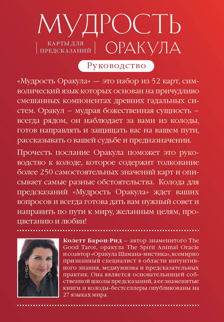 Колода «Мудрость оракула. Карты для предсказаний» от Колетт Барон-Рид, автора знаменитого The Good Tarot, оракула «Духи животных» и соавтора «Оракула Шамана-мистика» - это причудливое переплетение И-Цзин, скандинавских рун, Таро и других древних предсказательных систем. Оракул - мудрая божественная сущность - всегда рядом, он наблюдает за вами из колоды, готов направлять и защищать вас на вашем пути, рассказывать о вашей судьбе и предназначении. «Мудрость оракула. Карты для предсказаний» - это: • Мировой бестселлер, собравший более 7000 отзывов восторженных читательских отзывов. • Красочная колода из 52 карт с глянцевым покрытием. Образы для этой колоды, созданные художницей Дженой делла Гротталья, включают животных, элементы природы и различные символы, способные глубоко тронуть вас и настроить на искренний и душевный диалог о вашей жизни. • Руководство к колоде, которое содержит более 250 самостоятельных значений карт, правила гадания и простые расклады с примерами. Колетт Барон-Рид - автор знаменитого The Good Tarot, оракула The Spirit Animal Oracle и соавтор «Оракула Шамана-мистика», всемирно признанный специалист в области интуитивного знания, медиумизма и предсказательных практик. Она является основательницей собственной школы предсказаний, а ее знаменитые книги и колоды-бестселлеры опубликованы на 27 языках мира.