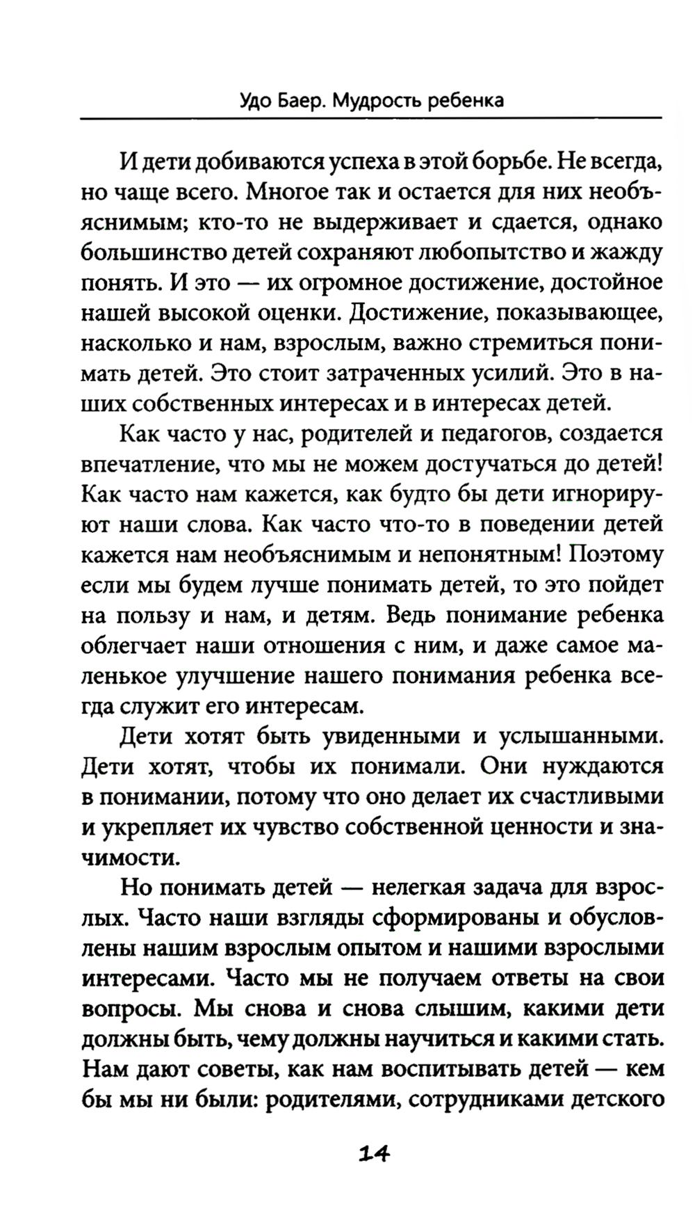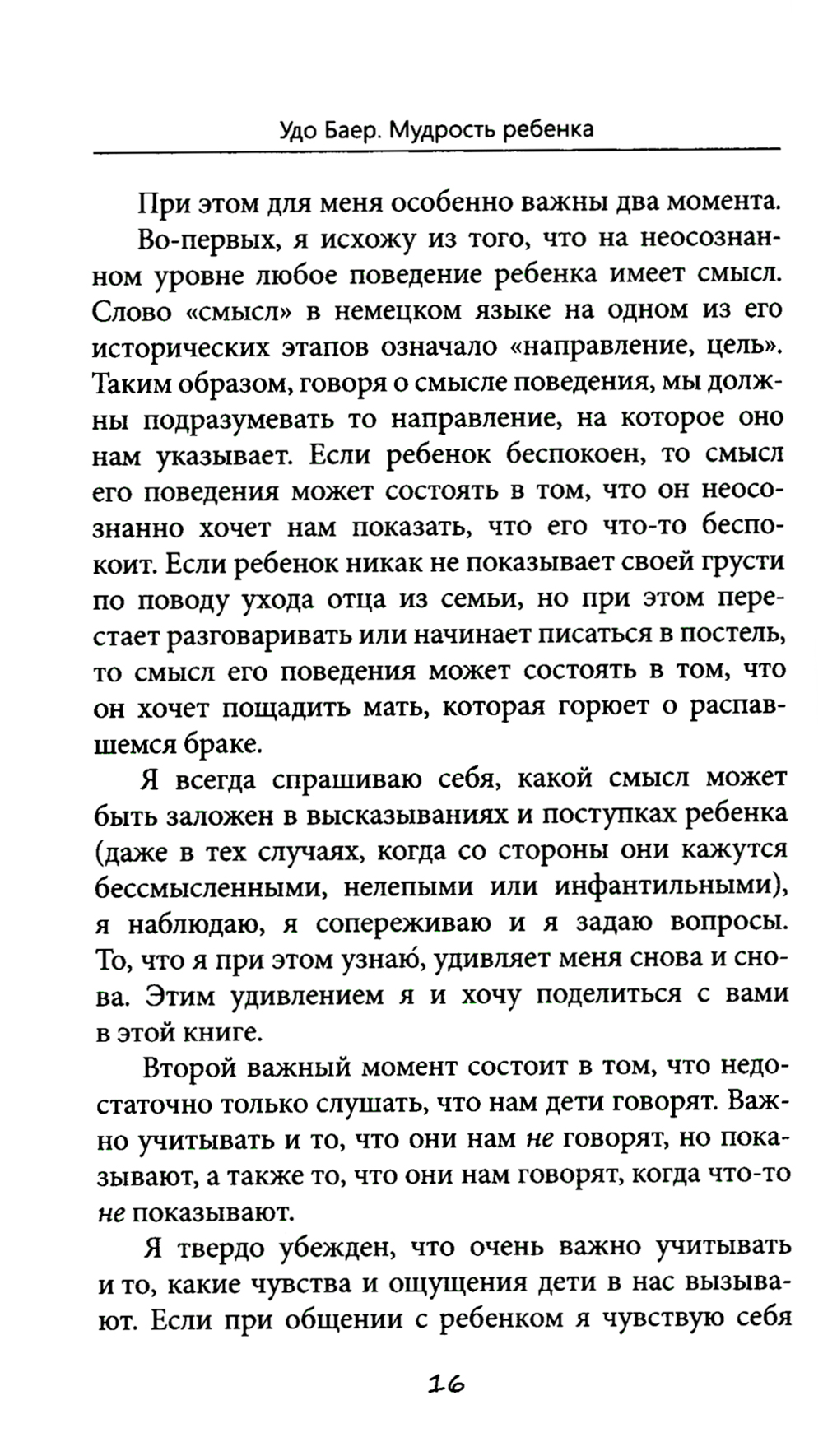 Детям, как правило, трудно словами рассказать о сложных эмоциональных состояниях, которые они испытывают, поэтому они подают взрослым важные сигналы своим поведением. Страхи, грусть, агрессия, непослушание, капризы, упрямство, нежелательные действия - все это те доступные детям способы достучаться до взрослых, которые автор книги, немецкий педагог и психотерапевт Удо Баер, называет мудростью ребенка. В предлагаемой книге автор раскрывает свой подход и объясняет, как увидеть глубокую взаимосвязь между действиями и эмоциями ребенка, с одной стороны, и ответными реакциями взрослых, такими как огорчение, злость, раздражение, подавленность, бессилие, - с другой. Рекомендации автора позволят родителям лучше понимать своего ребенка, адекватно и гибко реагировать на его поведение и помогут ему расти уверенным в себе, жизнерадостным и счастливым человеком. Книга адресована родителям, педагогам и всем взрослым, которые хотят лучше понимать детей.| Издательство | Рама Паблишинг |