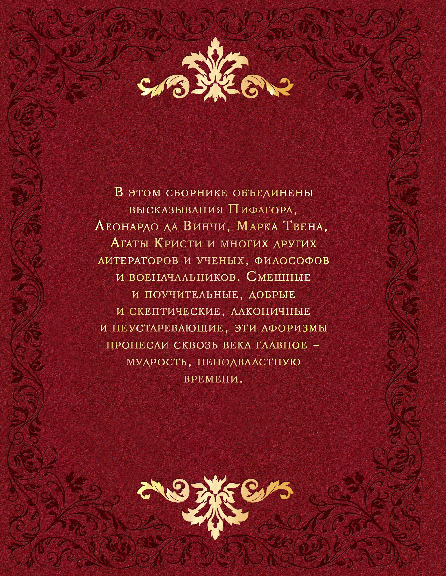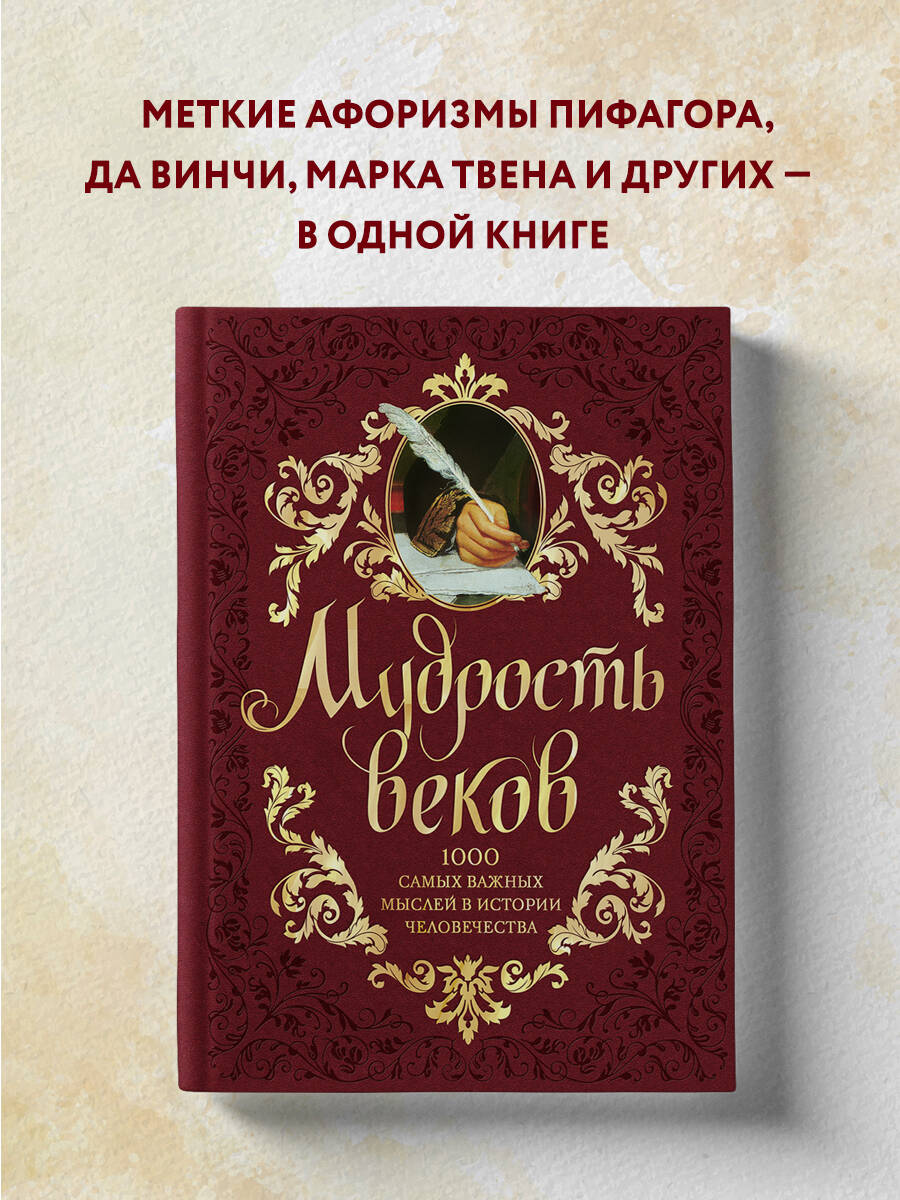 В нашей прекрасно иллюстрированной книге вы найдете афоризмы Пифагора, Леонардо да Винчи, Марка Твена, Агаты Кристи и многих других литераторов и ученых, философов и военачальников. В этих высказываниях есть главное - неподвластная времени мудрость. Читатель познакомится с наследием великих людей - 1000 кратких, но наполненных предельной четкостью и смыслом афоризмов. Сборник «Мудрость веков» станет вашим постоянным спутником, а лучшего подарка для близких людей и не придумать.| Издательство | ООО "Издательство "Эксмо" |