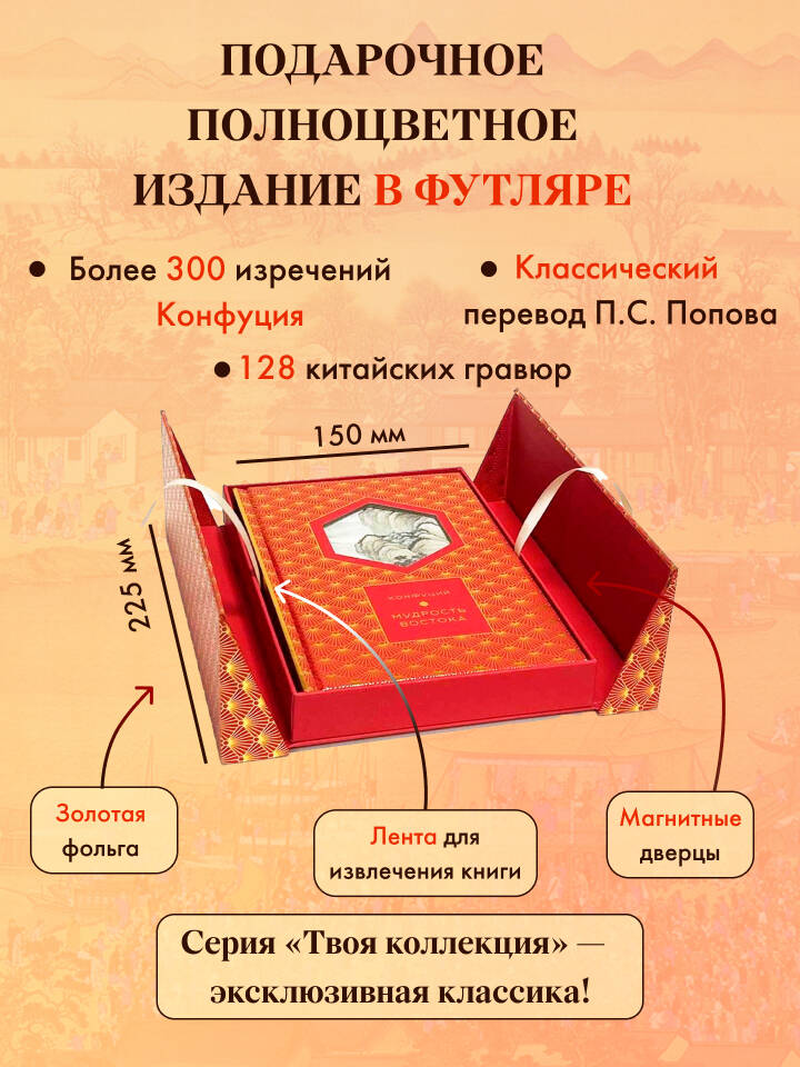 Учение Конфуция, основанное на человеколюбии, добродетели, верности традициям, мудрости и искренности, было распространено в Китае подобно учению Будды в Индии, а само конфуцианство имело статус государственной идеологии до начала XX века и даже называлось религией. В этом подарочном издании представлено более 300 философских изречения Конфуция из самой почитаемой книги конфуцианства - "Беседы и суждения", в профессиональном переводе П.С. Попова (1842-1913), а также воспоминания о Конфуции его учеников. Жемчужины восточной мудрости гармонично дополняют 128 классических китайских гравюр. Прикоснитесь к бессмертной душе Учителя, который уже более 2000 лет передаёт знания всё новым поколениям читателей, вдохновляя и поддерживая каждого из них на пути к Небу своими лаконичными, но мудрыми словами.| Издательство | Издательство "АСТ" |