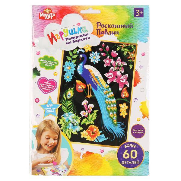 Набор для творчества "Раскраска на бархате. Роскошный Павлин" ТМ "МультиАрт" - отличный подарок для вашего ребенка, который будет способствовать развитию его творческих способностей. С помощью этого набора юный художник сможет самостоятельно создать яркую поделку, которую можно подарить дорогим людям или использовать для украшения детской комнаты. Комплектация и особенности: - основа для аппликации - стразы (более 60 деталей) - без клея и ножниц Набор для творчества ТМ "МультиАрт" развивает: - внимание и усидчивость - творческое мышление - сенсорное и цветовое восприятие - моторику рук - фантазию Размер: 17 х 23 см. Материал: картон + пластмасса. Рекомендовано детям от 3 лет.| Издательство | СИМБАТ ООО |