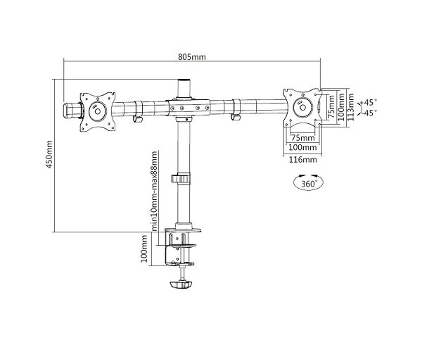 Регулируемая высота от столешницы до центра пластины VESA: 100 - 450 мм