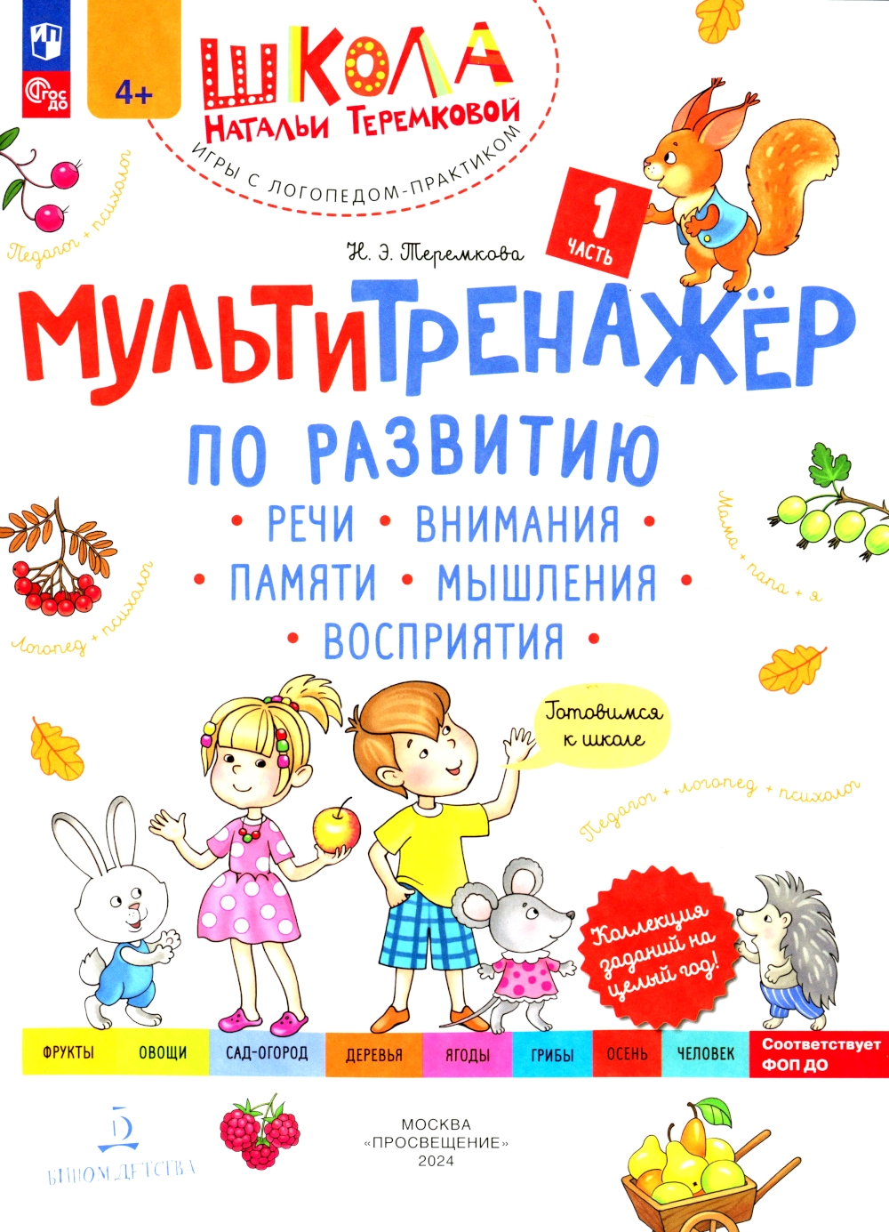 Мультитренажёр по развитию речи, внимания, памяти, мышления, восприятия. Часть 1. Осень. Теремкова Н.Э. «Мультитренажёр по развитию речи, внимания, памяти, мышления, восприятия. Ч. 1. Осень» входит в годовой курс тренировочно-игровых заданий для детей 5-7 лет по основным направлениям дошкольного образования. Мультитренажёр - это: - Полный комплект материалов для систематических занятий и подготовки к школе. - Мультиработа: педагог + логопед + психолог + родители + ребёнок. - 8 объёмных тем с игровыми заданиями: найти, раскрасить, дорисовать, запомнить, назвать по памяти, обвести, соединить, выполнить по образцу, найти отличия, пройти лабиринт, найти ошибки и многие другие. - 8 текстов для чтения и пересказа по картинкам. - Мультизадания для всех вместе!