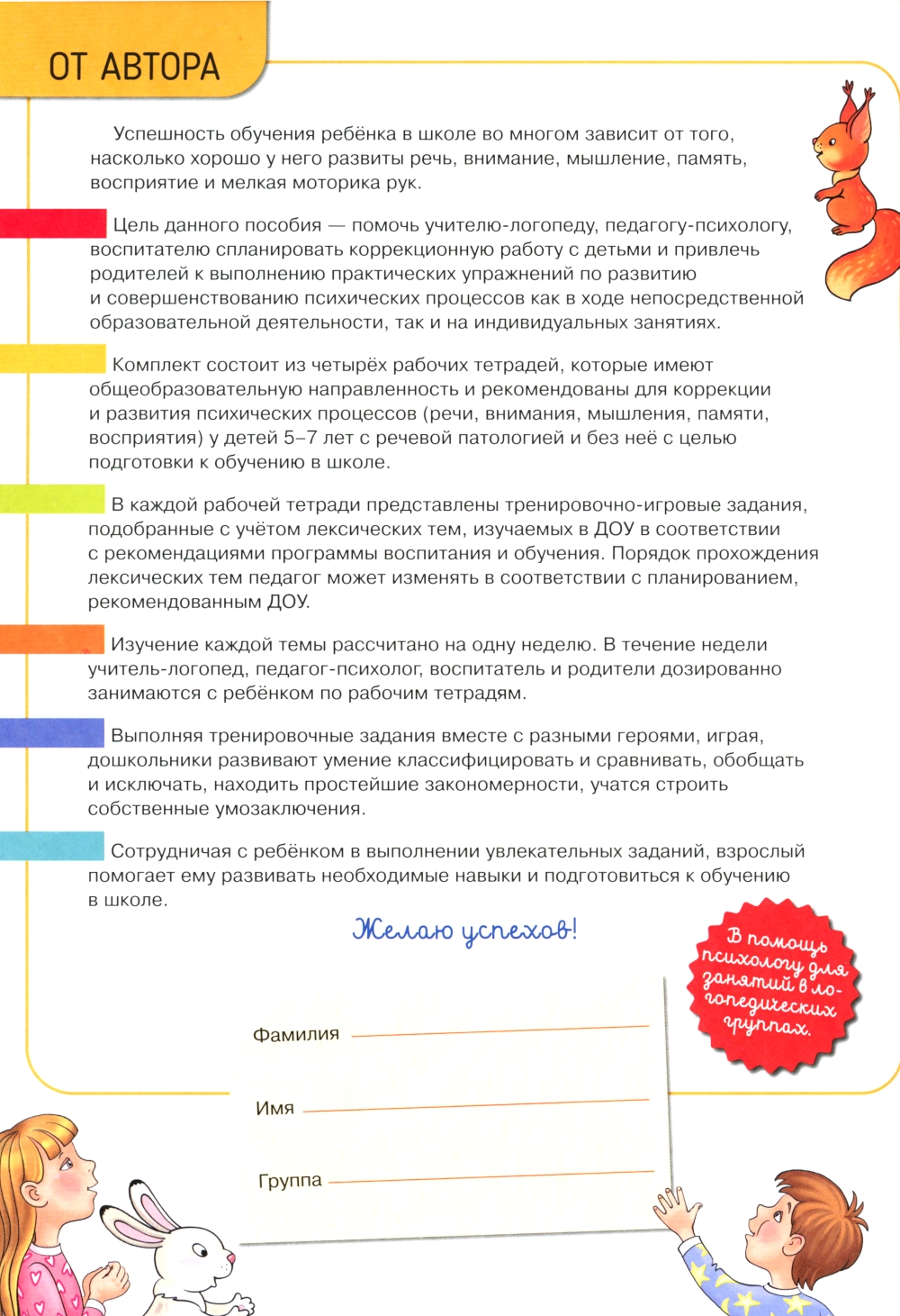 Успешность обучения ребёнка в школе во многом зависит от того, насколько хорошо у него развиты речь, внимание, мышление, память, восприятие и мелкая моторика рук. Цель данного пособия - помочь учителю-логопеду, педагогу-психологу, воспитателю спланировать коррекционную работу с детьми и привлечь родителей к выполнению практических упражнения по развитию и совершенствованию психических процессов как в ходе непосредственной образовательной деятельности, так и на индивидуальных занятиях. Комплект состоит из четырёх рабочих тетрадей, которые имеют общеобразовательную направленность и рекомендованы для коррекции и развития психических процессов (речи, внимания, мышления, памяти, восприятия) у детей 5-7 лет с речевой патологией и без неё с целью подготовки к обучению в школе. В каждой рабочей тетради представлены тренировочно-игровые задания, подобранные с учётом лексических тем, изучаемых в ДОУ в соответствии с рекомендациями программы воспитания и обучения. Порядок прохождения лексических тем педагог может изменять в соответствии с планированием, рекомендованным ДОУ. Изучение каждой темы рассчитано на одну неделю. В течение недели учитель-логопед, педагог-психолог, воспитатель и родители дозированно занимаются с ребёнком по рабочим тетрадям. Выполняя тренировочные задания вместе с разными героями, играя, дошкольники развивают умение классифицировать и сравнивать, обобщать и исключать, находить простейшие закономерности, учатся строить собственные умозаключения. Сотрудничая с ребёнком в выполнении увлекательных заданий, взрослый помогает ему развивать необходимые навыки и подготовиться к обучению в школе.| Издательство | Просвещение |