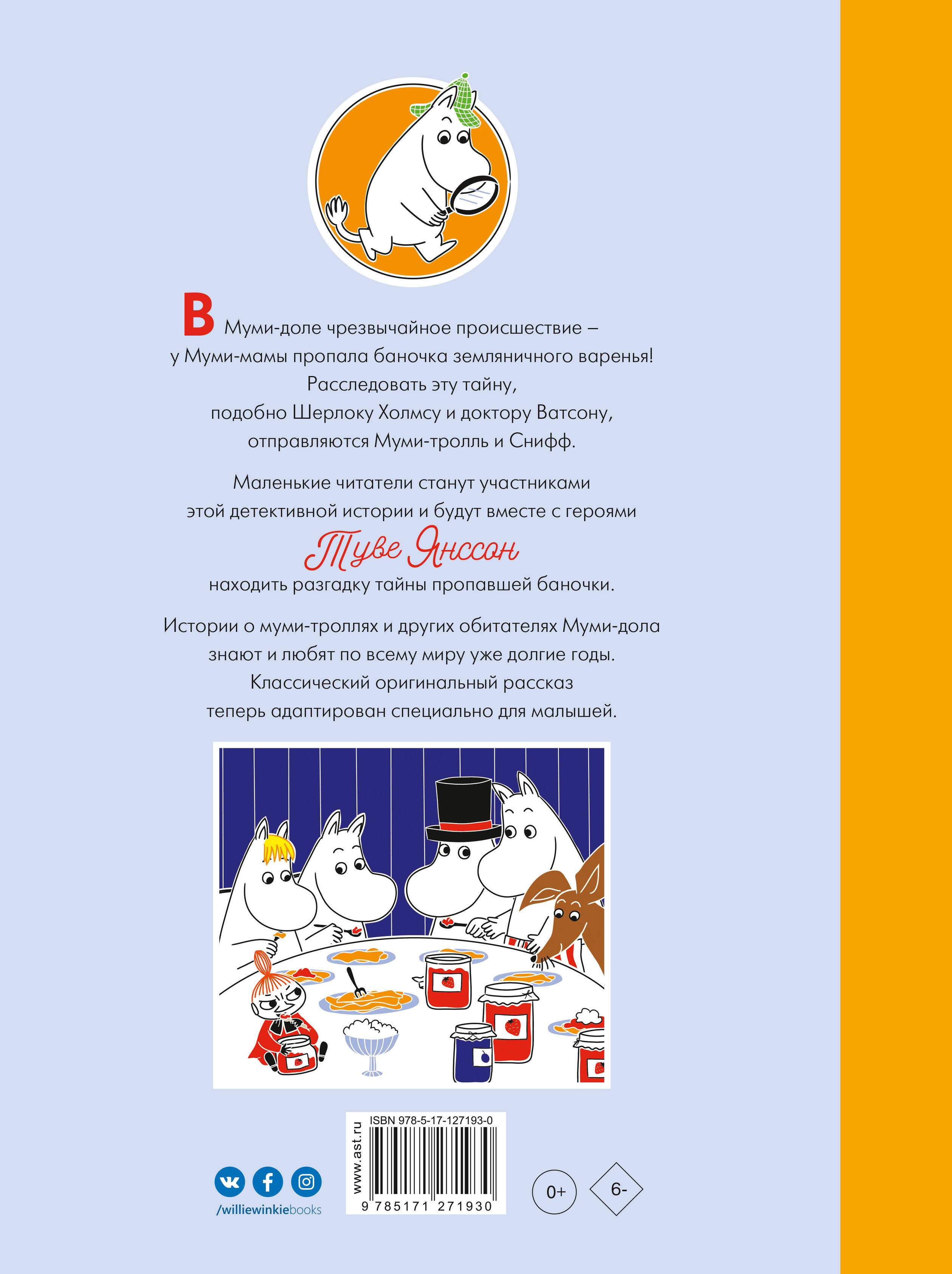 В Муми-доле чрезвычайное происшествие - у Муми-мамы пропала баночка земляничного варенья! Расследовать эту тайну, подобно Шерлоку Холмсу и доктору Ватсону, отправляются Муми-тролль и Снифф. Маленькие читатели станут участниками этой детективной истории и будут вместе с героями Туве Янссон находить разгадки тайны пропажи баночки варенья. Для детей до 3-х лет.