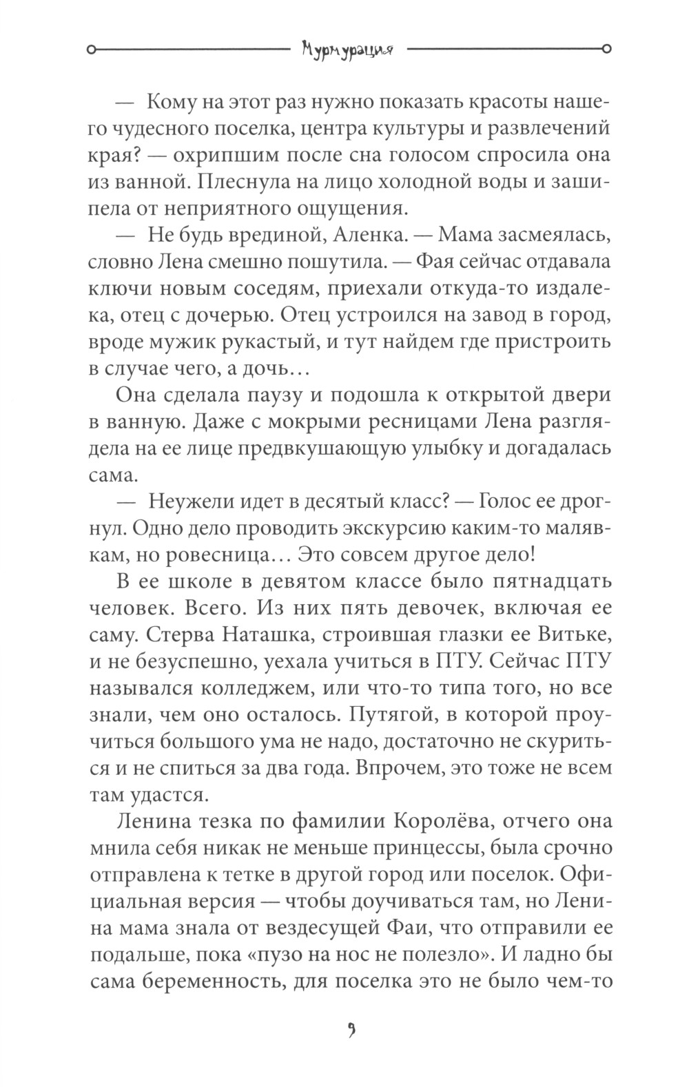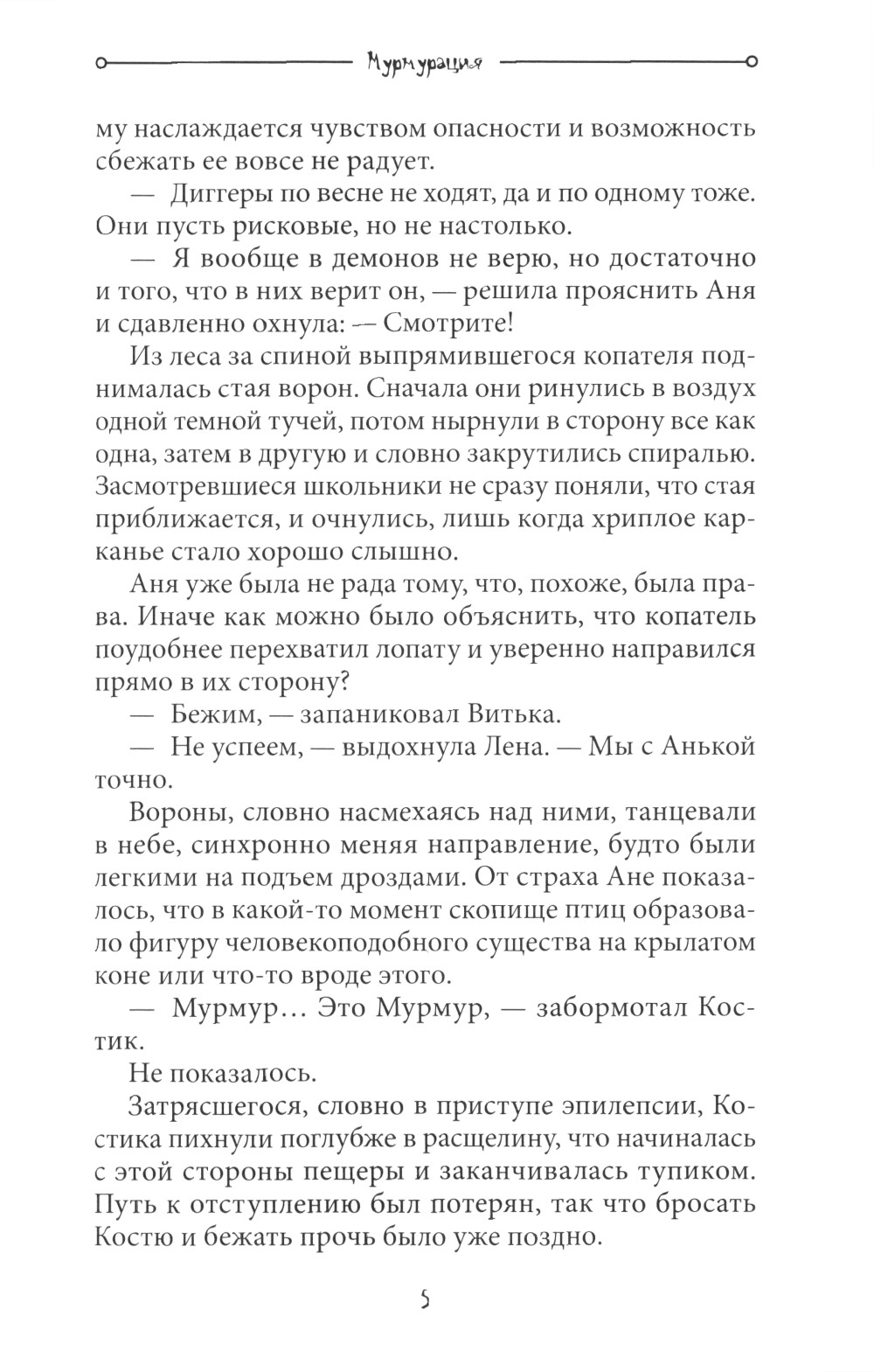 Страшное событие в жизни шестнадцатилетней Ани вынуждает её бежать от прошлого. Вместе с отцом они оседают в тихом с виду посёлке, где люди доброжелательны, природа - загляденье, а в небе рисуют завораживающие узоры огромные стаи птиц. Но как скрыть от окружающих, что после всего пережитого ты теперь боишься собственной тени? И как сохранить спокойствие в месте, где будто бы у каждого есть свой секрет? Где физрук приносит животных в жертву Мурмуру, а вблизи местной достопримечательности определённо слышится запах... крови?| Издательство | Крафтовая литература |