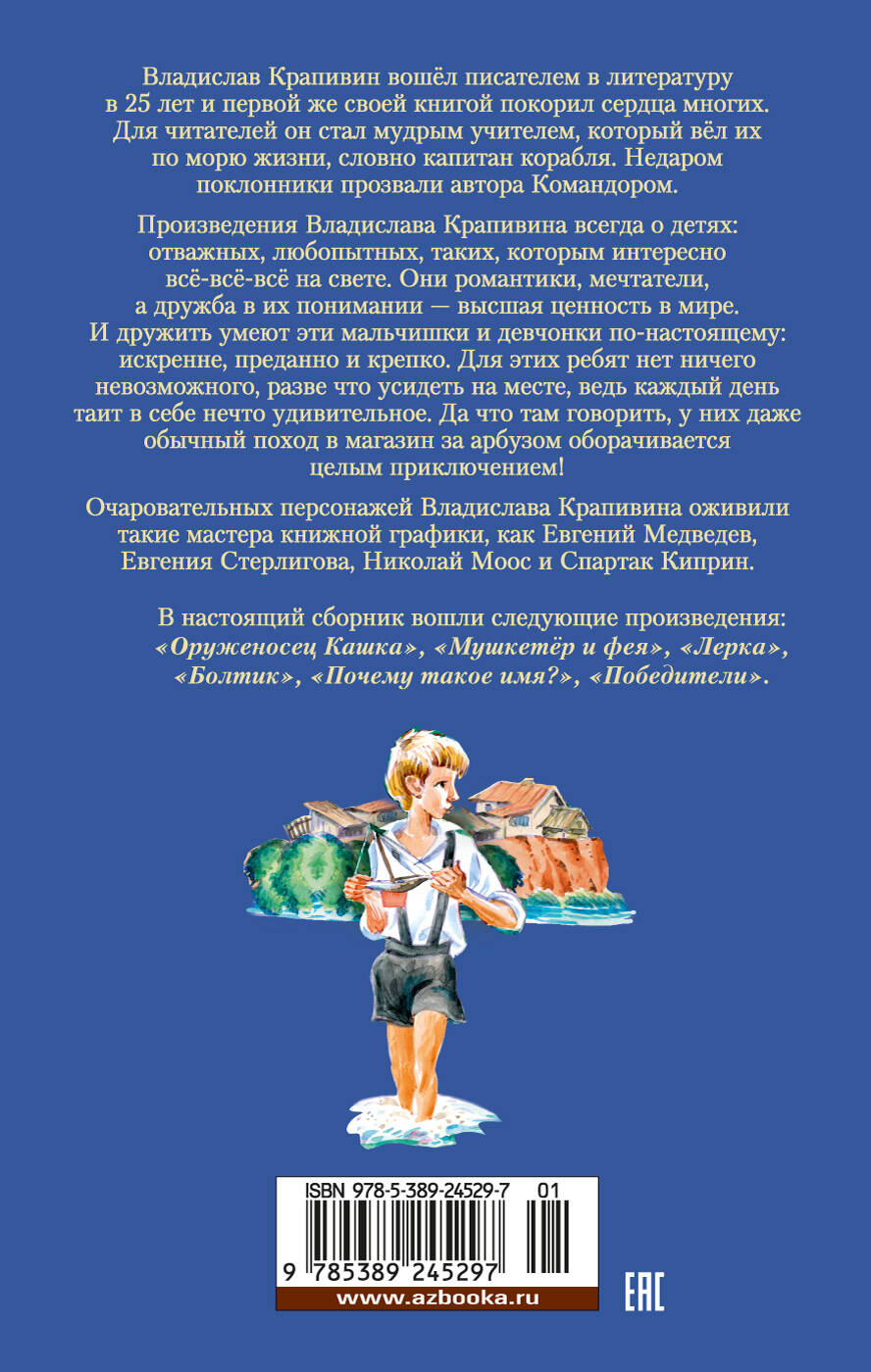Женя Воробьёв по прозвищу Джонни - один из самых обаятельных персонажей книг Владислава Крапивина. Озорной, смекалистый, с воображением, которому позавидует каждый - это всё о Джонни. Он запросто превращает любую трудность в захватывающее приключение, да и с врагами разбирается на раз-два. Кажется, ничто на свете не способно смутить такого смельчака, но однажды Джонни влюбляется… А вот главный герой повести "Оруженосец Кашка" - полная противоположность Джонни. Робкий, задумчивый и порой немного рассеянный, Кашка весь под стать своему имени, ведь он незаметный, как полевая кашка в траве - пройдёшь и не увидишь. Всё меняется в тот день, когда в лагере решили устроить турнир лучников. Став оруженосцем лучшего в лагере стрелка Володи Новосёлова, Кашка притянул к себе, словно магнит все неприятности, но неожиданно обрёл настоящего друга. Друга, о котором можно написать маме: "…я жыву хорошо патамушто Валодя". Ребята из произведений Владислава Крапивина - отважные мечтатели и верные товарищи. Из раза в раз преодолевая страх и неуверенность в себе, они взрослеют и учатся ценить самое прекрасное, что есть в мире - дружбу. Истории о них очаровательны, как и сами герои, поэтому точно придутся по душе и детям, и их родителям.| Издательство | Азбука-Аттикус Издат.группа ООО |