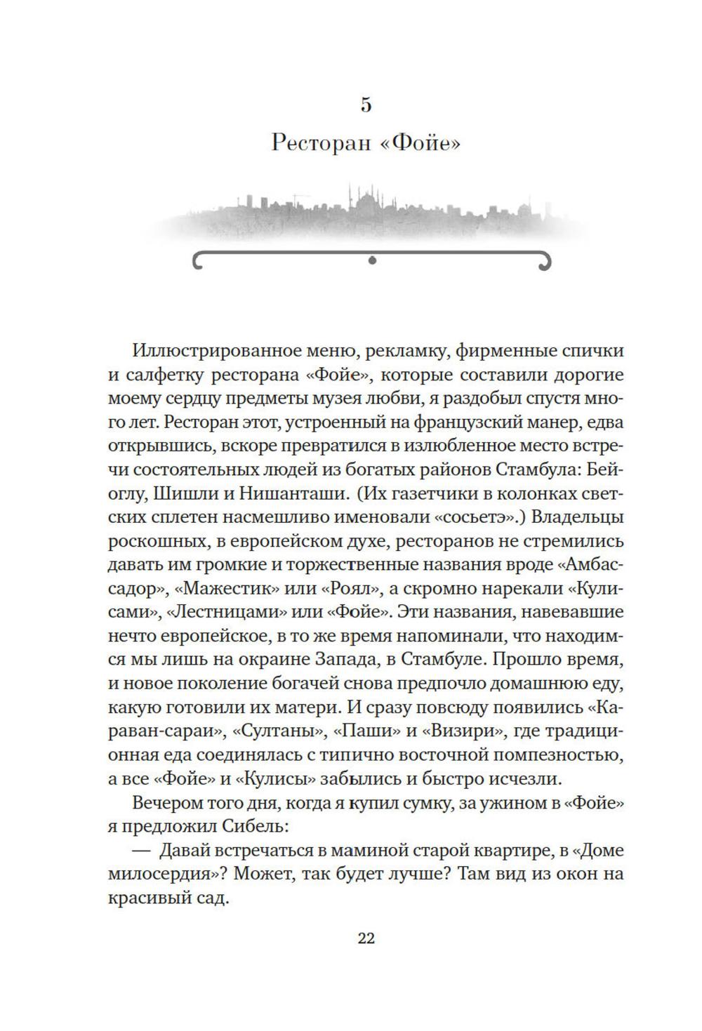 В Музее Невинности собраны предметы, которые способны рассказать свою особую историю: коробок спичек, карманный фонарик, потерянная сережка... Проходя по его залам, читатель незаметно погружается в атмосферу любви и печали, столь характерную для творчества Орхана Памука. В основу его романа «Музей Невинности» положена история отношений между отпрыском состоятельной семьи, стоящим на пороге выгодной помолвки, и неожиданно встреченной им подругой детства; история, бережно хранимая в особом музее, созданном «не для того, чтобы ходить по нему и смотреть на вещи, а для того, чтобы чувствовать и жить».| Издательство | Азбука |