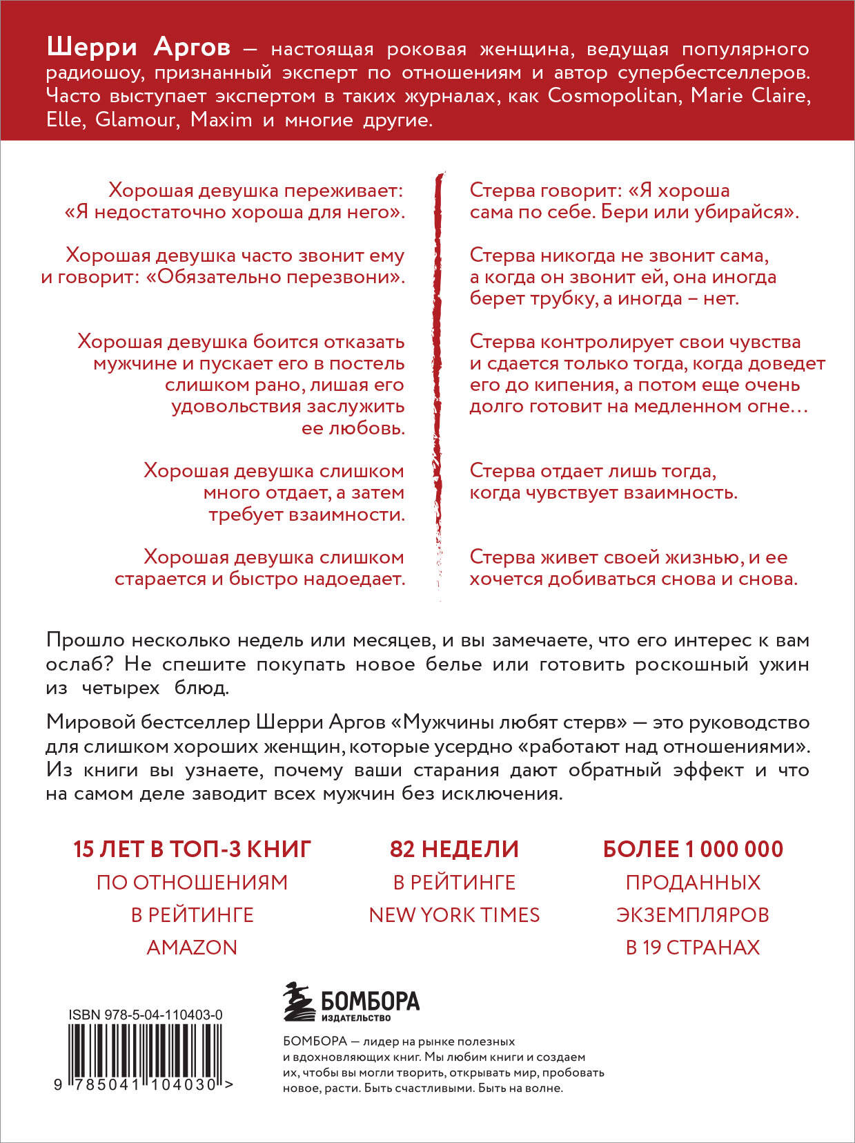 15 лет в ТОП-3 книг по отношениям в рейтинге Amazon.com. 82 недели в рейтинге New York Times. Более 20 000 000 проданных экземпляров в 19 странах. Прошло несколько недель или месяцев, и вы замечаете, что его интерес к вам ослаб. Не спешите покупать новое белье или готовить роскошный ужин из четырех блюд. Мировой бестселлер Шерри Аргов «Мужчины любят стерв» - это руководство для слишком хороших женщин, которые усердно «работают над отношениями». Из книги вы узнаете, почему ваши старания дают обратный эффект и что на самом деле заводит всех мужчин без исключения. 100 принципов привлекательности, которые сформулировала для вас Шерри, помогут вам всегда оставаться для него женщиной мечты, которую необходимо добиваться вновь и вновь. И вы сможете развивать ваши отношения по своему собственному сценарию.| Издательство | ООО "Издательство "Эксмо" |