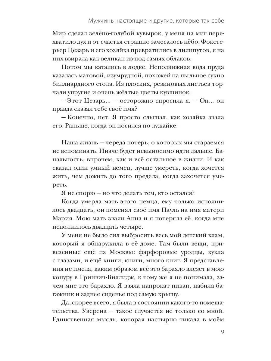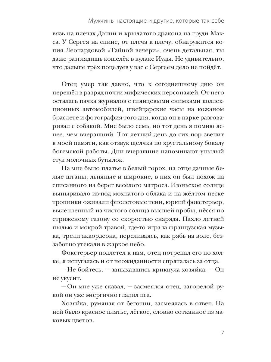 «…Дэнни, Сергей, Макс или Игорь принадлежат к племени ручных мужчин. Ты можешь владеть ими, они с готовностью домашних животных пойдут за тобой на край света… Ты можешь вертеть ими, играть, как в детстве ты играла куклами, впрочем, именно эта податливость и делает их такими неинтересными. Их всех объединяет тихая покорность, которую в глубине души они принимают за любовь к тебе. Есть и другое племя. Оно немногочисленно, и особи его встречаются весьма нечасто. Мужчина этого племени носит странное имя, оно похоже на географическое название то ли реки, то ли малонаселённого американского штата. Иногда его имя напоминает звук, издаваемый стальными механизмами. Короткий и холодный звук...»| Издательство | Т8 RUGRAM |