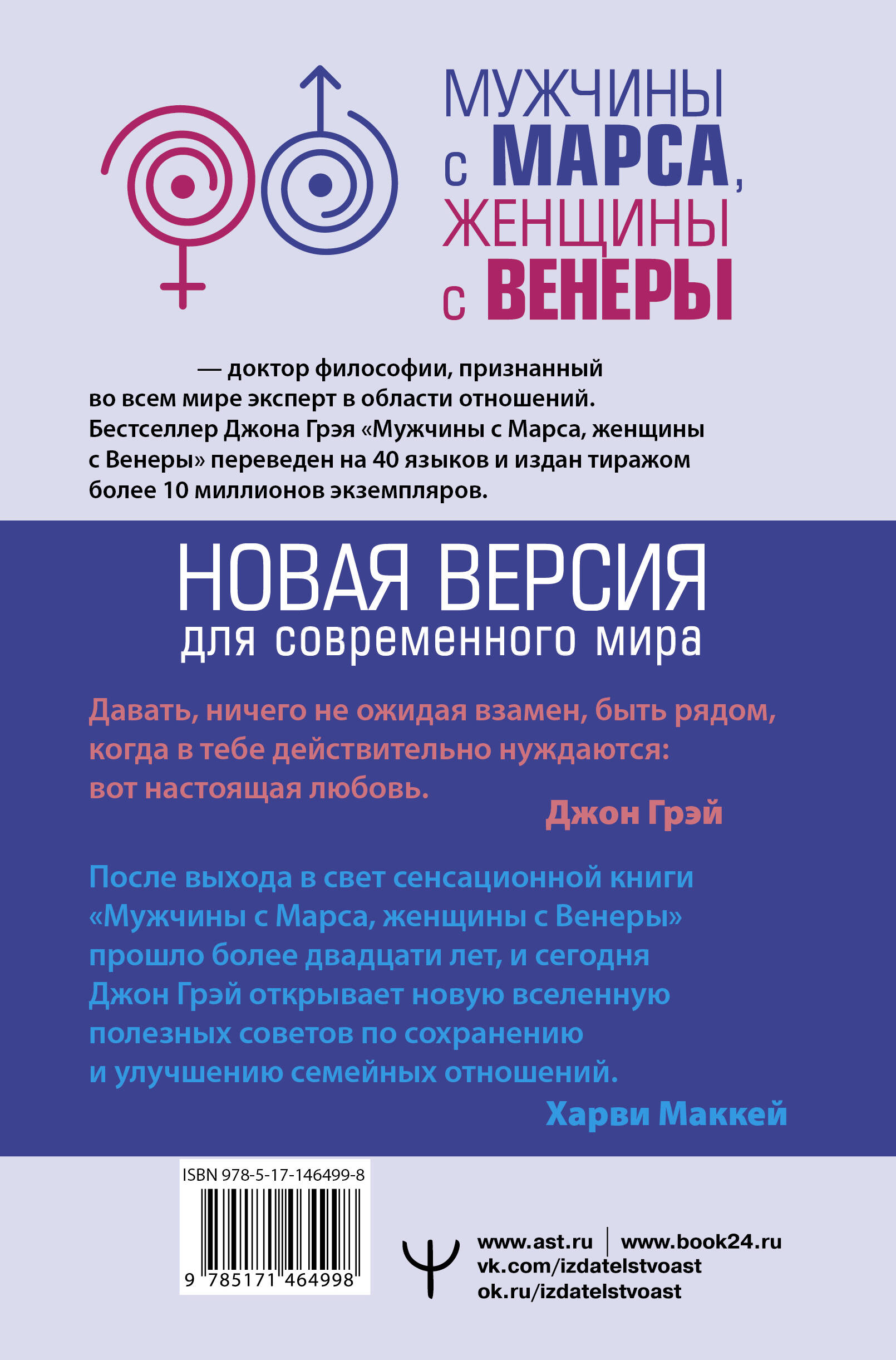 Книга Джона Грэя «Мужчины с Марса, женщины с Венеры. Новая версия для современного мира. Умения, навыки, приемы для счастливых отношений» - спасение от кризиса отношений. Если вы задаетесь вопросом, как сохранить любовь, как сделать брак счастливым, как вернуть теплые отношения и влечение, эта книга для вас. Джон Грэй - доктор философии, признанный во всем мире эксперт в области отношений. Бестселлер Джона Грэя «Мужчины с Марса, женщины с Венеры» переведен на 40 языков и издан тиражом более 10 миллионов экземпляров.| Издательство | ИЗДАТЕЛЬСТВО "АСТ" |