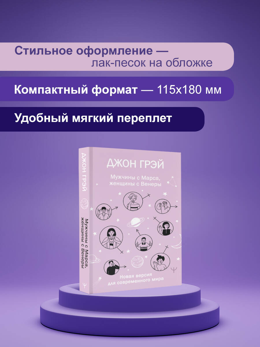 Новое издание бестселлера по отношениям в удобном формате и мягком переплете, которое легко носить с собой! Более 30 лет назад психолог Джон Грэй издал книгу, которая перевернула представления об отношениях, - "Мужчины с Марса, женщины с Венеры". Эта книга убедительно доказала, что мужчины и женщины мыслят, чувствуют и действуют по-разному. И это была настоящая сенсация! Изучая книгу, сотни тысяч мужчин и женщин по всему миру учились понимать друг друга, становились счастливыми, спасали отношения. Но в XXI веке некоторые советы стали уже неактуальны: мир изменился! То, что было спасением в прошлом веке, сегодня перестало работать. Но все эти годы Джон Грэй продолжал работу с парами, консультировал, внимательно изучал тенденции нового мира. Так появилась эта книга, которая объединяет в себе открытия оригинала с современным взглядом на отношения. Из этой книги вы узнаете: • как изменились мужчины и женщины за последние двадцать лет; • какие действия и слова провоцируют конфликты в современной семье; • как правильно разговаривать со своим партнером; • как выглядят здоровые взаимоотношения; • как сохранять влечение друг к другу на долгие годы; • как обрести любовь и дать ее близкому человеку; • и многое другое!| Издательство | Издательство "АСТ" |