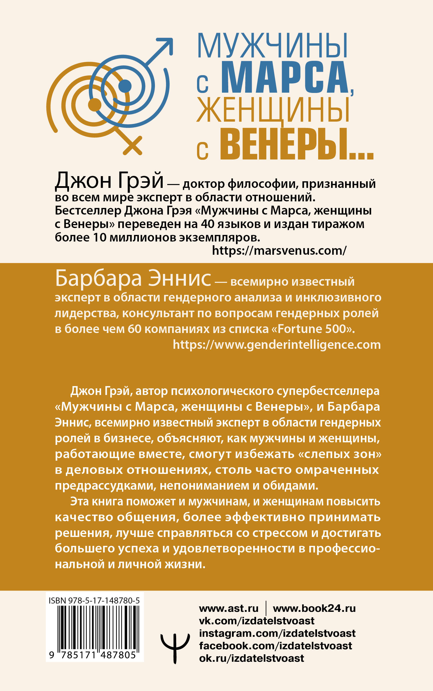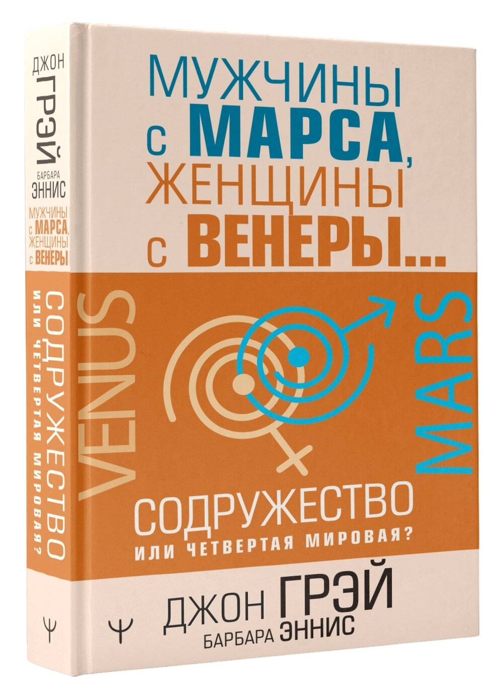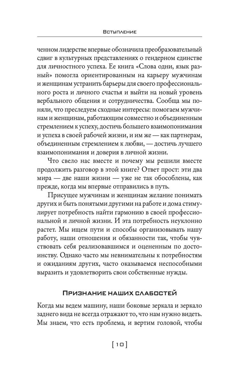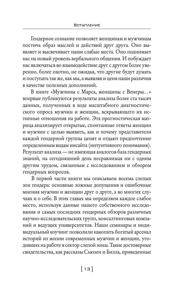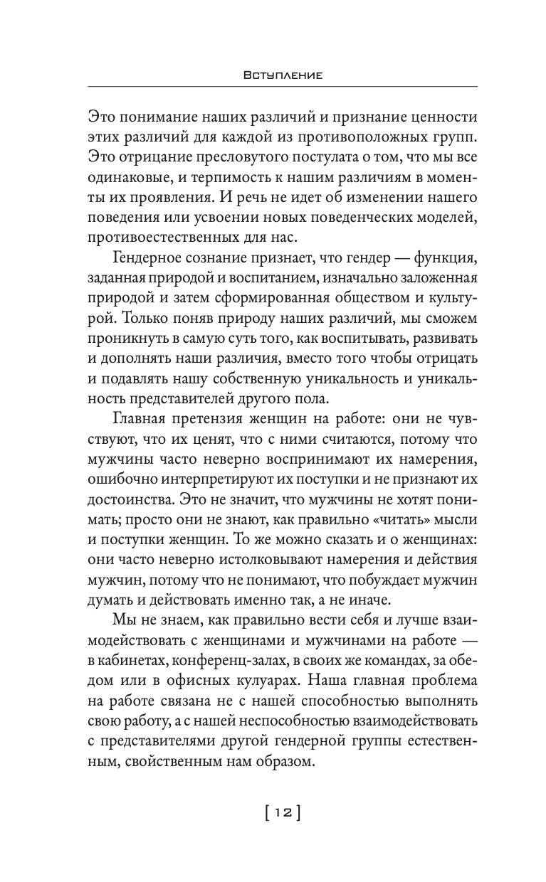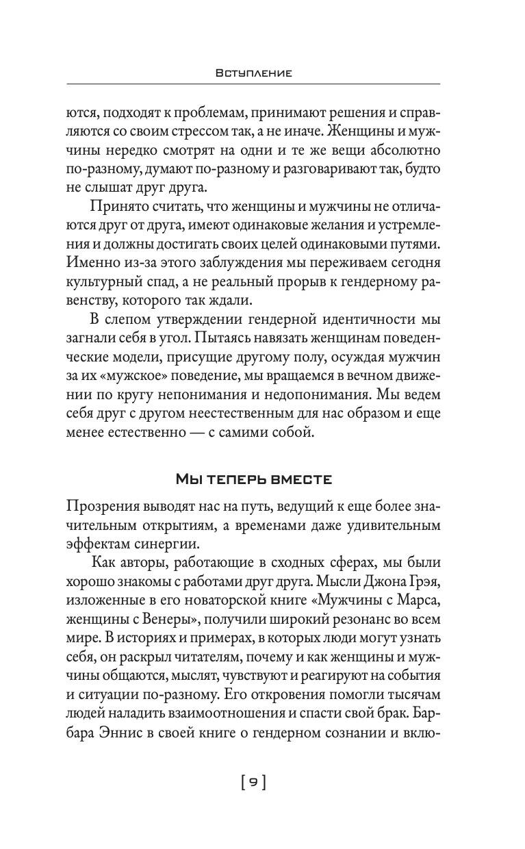 «Мужчины с Марса, женщины с Венеры… Содружество или четвертая мировая?» - незаменимое руководство к действию для каждого человека, который желает наладить деловые отношения с противоположным полом! Это книга для женщин, которые считают, что мужчины, с которыми они работают, их «не слышат». И для мужчин, которые не всегда могут найти общий язык со своими коллегами-женщинами. Большинство проблем между мужчинами и женщинами возникает в результате фундаментальных психологических различий, которые автор иллюстрирует оригинальной метафорой, помещенной в название книги. Оба пола запрограммированы только для условий своей собственной «планеты». Эта разница проявляется в самых банальных ситуациях и отношений к ним. Например, если у мужчины проблемы, то он будет стремиться к их решению, а женщина, наоборот, в таком случае будет больше говорить, нежели действовать. Джон Грэй считает, что представители обоих полов вполне могут друг друга понять и в итоге договориться. Джон Грей - американский семейный консультант, лектор и писатель. В течение девяти лет он занимался трансцендентальной медитацией с индийским гуру Махариши Махеш Йоги. В 1992 году он выпустил книгу «Мужчины с Марса, женщины с Венеры». Согласно исследованию американского издательства HarperCollins, эта книга стала самой популярной в сфере научной литературы за все времена. С 2003 года Джон Грэй является членом Американской ассоциации консультирования. На сегодняшний день он издал 17 книг об отношениях и личностном развитии. Барбара Эннис - всемирно известный эксперт в области гендерного анализа и инклюзивного лидерства, консультант по вопросам гендерных ролей в более чем 60 компаниях из списка «Fortune 500» и в правительствах 10 стран мира.| Издательство | АСТ |