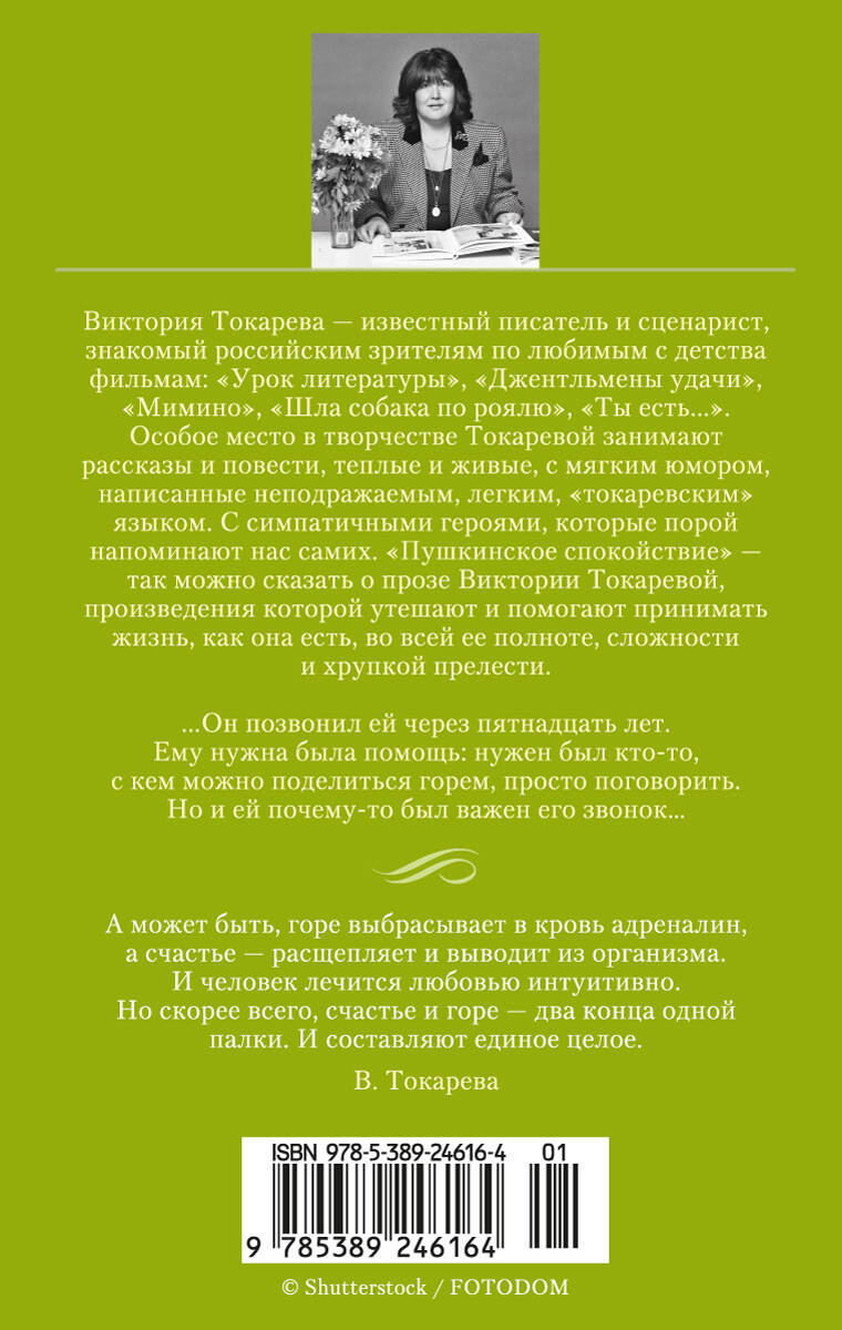 Виктория Токарева - известный писатель и сценарист, знакомый российским зрителям по любимым с детства фильмам: "Урок литературы", "Джентльмены удачи", "Мимино", "Шла собака по роялю", "Ты есть...". Особое место в творчестве Токаревой занимают рассказы и повести, теплые и живые, с мягким юмором, написанные неподражаемым, легким, "токаревским" языком. С симпатичными героями, которые порой напоминают нас самих. "Пушкинское спокойствие" - так можно сказать о прозе Виктории Токаревой, произведения которой утешают и помогают принимать жизнь, как она есть, во всей ее полноте, сложности и хрупкой прелести. ...Он позвонил ей через пятнадцать лет. Ему нужна была помощь: нужен был кто-то, с кем можно поделиться горем, просто поговорить. Но и ей почему-то был важен его звонок… В настоящее издание вошли повести и рассказы 2000-х годов.| Издательство | Азбука-Аттикус Издат.группа ООО |