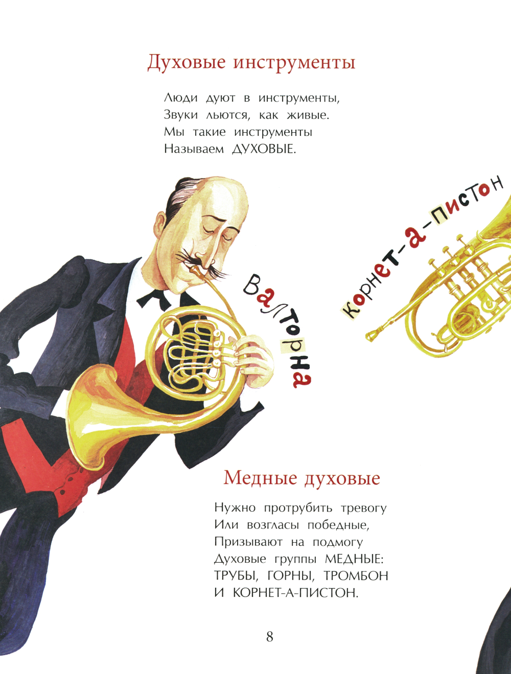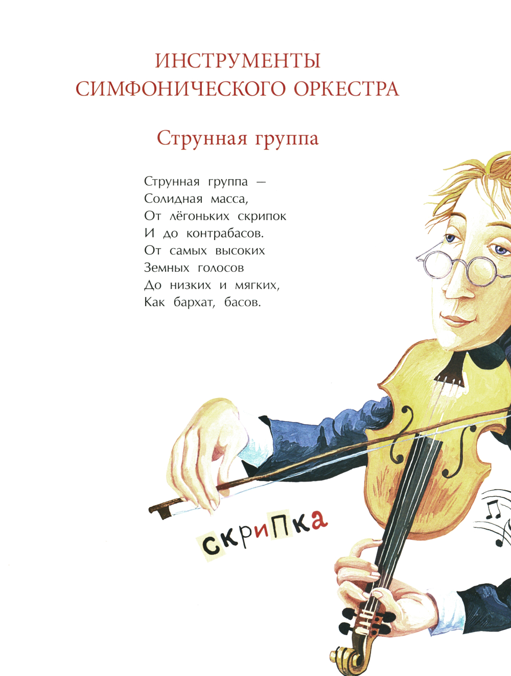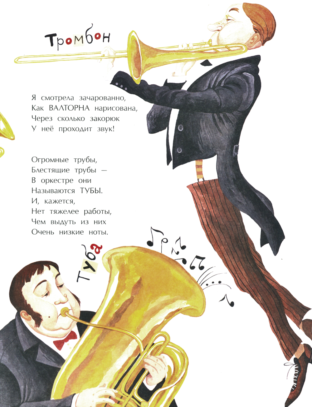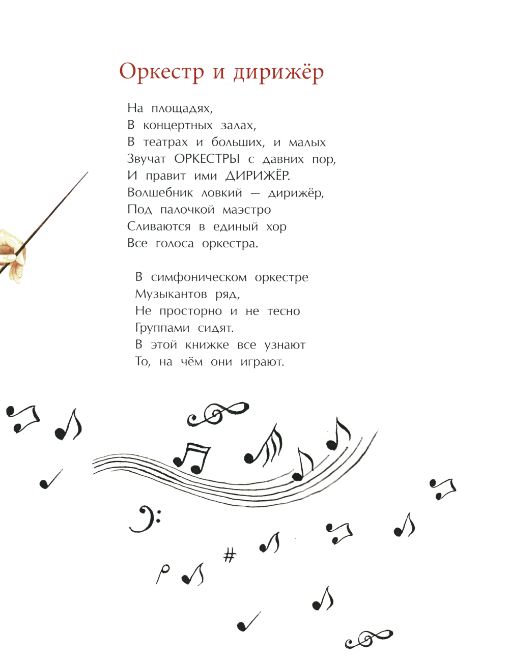 Очень неожиданное издание. С одной стороны - это книга стихов. А с другой - целая музыкальная энциклопедия, представляющая маленькому читателю все инструменты симфонического оркестра (струнные, духовые, ударные, клавишные), а также народные (гармонь, балалайка, мандолина, волынка) и другие инструменты (от саксофона и банджо, гитары, электрогитары до огромного органа). Каждому из них посвящены ясные, точные, запоминающиеся стихотворные характеристики и необыкновенно выразительные рисунки, которые позволяют увидеть не только конкретные инструменты, но и музыкантов-исполнителей, как бы погружают в стихию музыки, в жизнь большого оркестра, рассказывают о роли дирижера, о том, как проходят репетиции. Книга не только расширяет культурный кругозор ребенка, но и помогает увлечься музыкой, рождает желание учиться мастерству, чтобы в будущем передать в звуках музыку своей души.