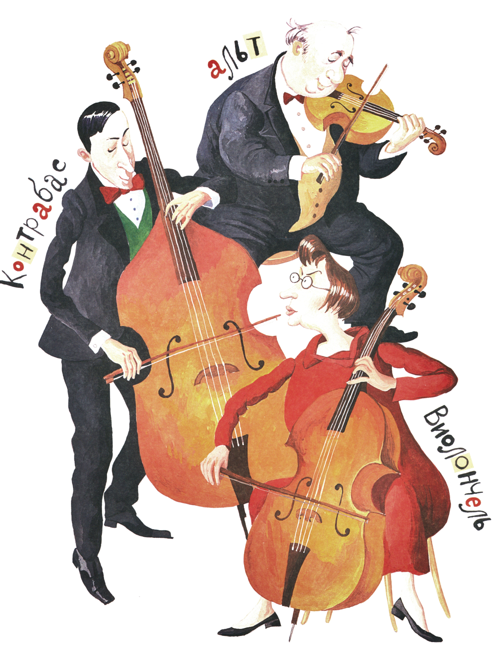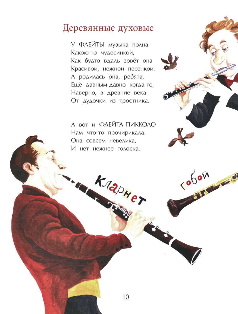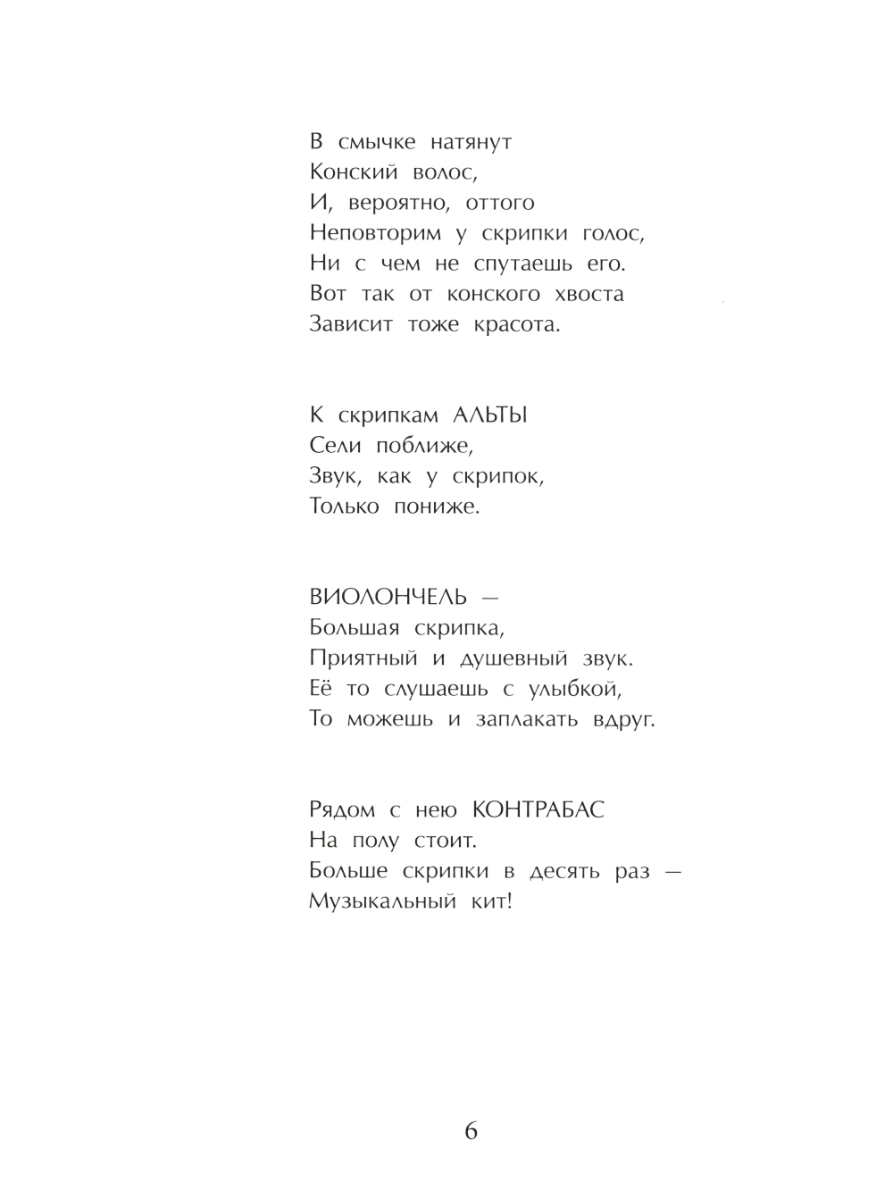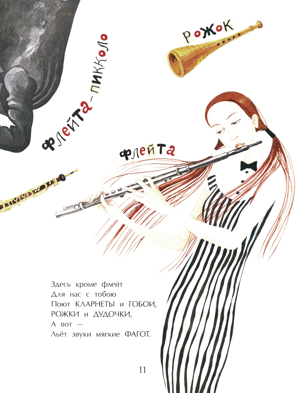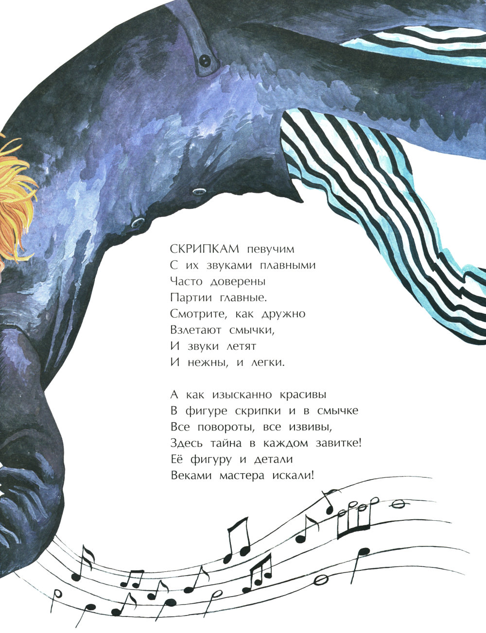 Очень неожиданное издание. С одной стороны - это книга стихов. А с другой - целая музыкальная энциклопедия, представляющая маленькому читателю все инструменты симфонического оркестра (струнные, духовые, ударные, клавишные), а также народные (гармонь, балалайка, мандолина, волынка) и другие инструменты (от саксофона и банджо, гитары, электрогитары до огромного органа). Каждому из них посвящены ясные, точные, запоминающиеся стихотворные характеристики и необыкновенно выразительные рисунки, которые позволяют увидеть не только конкретные инструменты, но и музыкантов-исполнителей, как бы погружают в стихию музыки, в жизнь большого оркестра, рассказывают о роли дирижера, о том, как проходят репетиции. Книга не только расширяет культурный кругозор ребенка, но и помогает увлечься музыкой, рождает желание учиться мастерству, чтобы в будущем передать в звуках музыку своей души.
