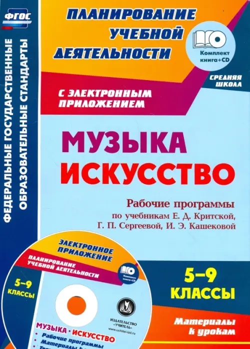 Предлагается комплект (книга+диск), представленный рабочими программами по музыке и искусству для 5-9 классов в пособии и электронном приложении с моделями рабочих программ, материалами к урокам, творческими заданиями, разработанный в соответствии с положениями ФГОС ООО, ориентированный на работу по учебникам Е.Д. Критской, Г.П. Сергеевой, И.Э. Кашековой (М.: Просвещение, 2016).