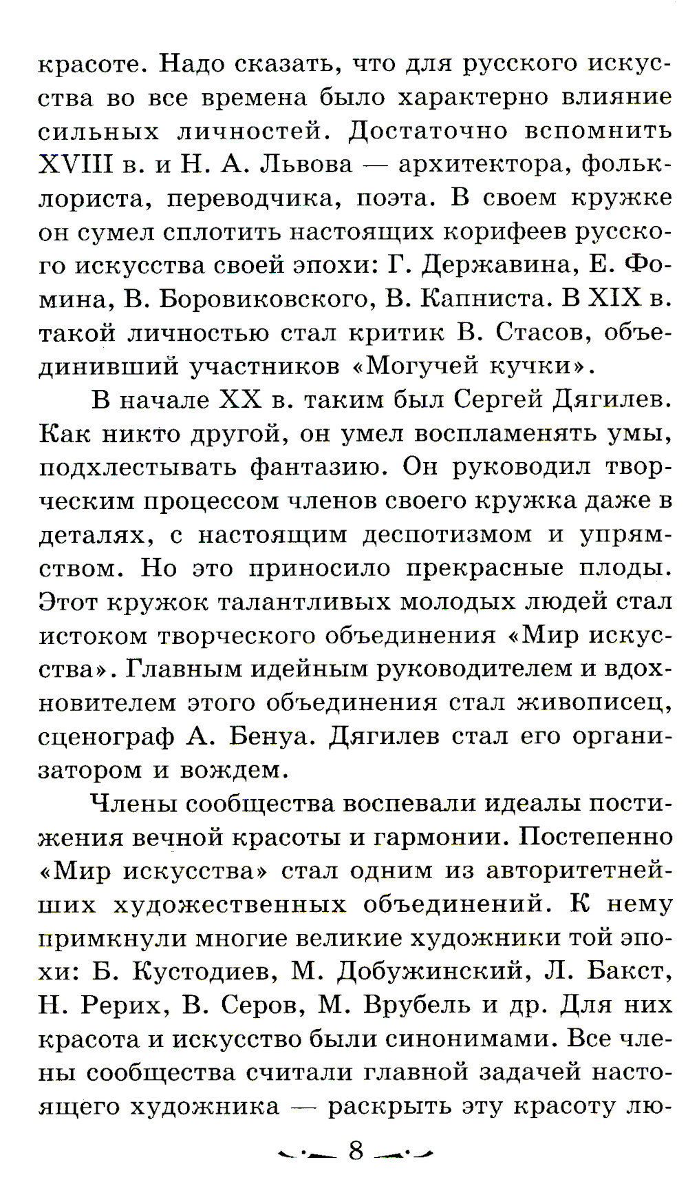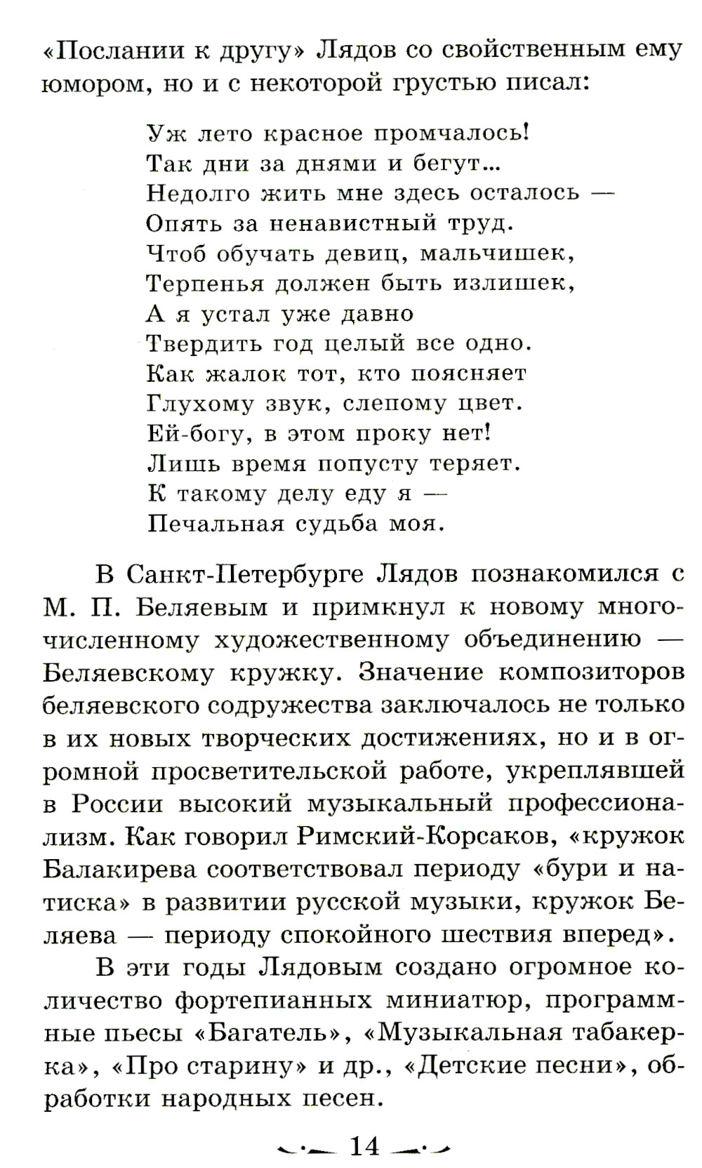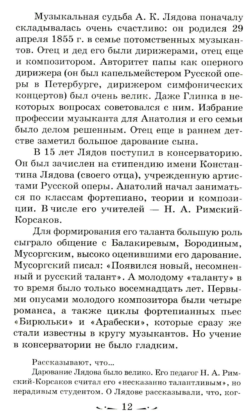 Появление данного учебного пособия связано с тем, что традиционная Программа по музыкальной литературе для ДМШ вышла в свет в 1956 г. и, не меняясь качественно, выдержала затем несколько переизданий (1962, 1970, 1979, 1982 гг.). Естественно, многие установки и тематические планы типовой программы устарели и не соответствуют требованиям новых подходов и методик музыкального воспитания детей. В последние годы стали появляться другие модели программ, учебные планы, адаптирующие содержание курса к новым историческим и социально-культурным условиям. Настоящее пособие опирается на многолетний опыт преподавания предмета «Музыкальная литература» в ДМШ, изложенный в авторских программах и методических рекомендациях Б. Лисянской, Ю. Агеевой, А. Хотунцова, М. Куклинской и др. Самые существенные изменения в этих программах коснулись русской музыки XX века. Поэтому в пособие, помимо традиционных тем, вошло освещение жизни и творчества композиторов рубежа XIX и XX веков А. Лядова, В. Калинникова, С. Рахманинова, А. Скрябина, И. Стравинского. В государственной программе никак не затрагивается музыка композиторов второй половины XX в. В данное пособие включены разделы, посвященные Г. Свиридову, Р. Щедрину, а также обзорное занятие о представителях российского авангарда Э. Денисове, С. Губайдулиной и А. Шнитке. Последние главы пособия - краткий обзор развития джаза и небольшой словарь джазовых терминов. При создании данного пособия мы учитывали то, что к числу основных задач музыкальных школ относится не только развитие музыкальных способностей детей, понимания основ классического и современного музыкального творчества, но и подготовка активных слушателей и любителей музыки. Поэтому в нашу книгу вошли также дополнительные ознакомительные материалы. Они объединены в рубрику «Рассказывают, что..» и обращены к широким массам детской аудитории.