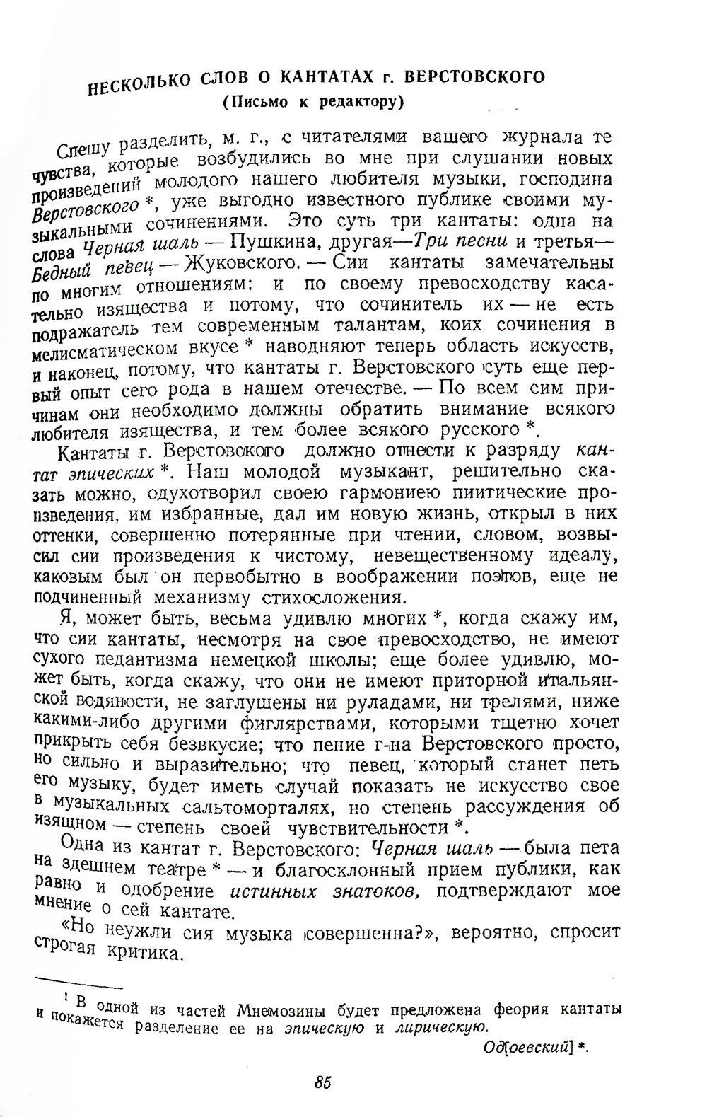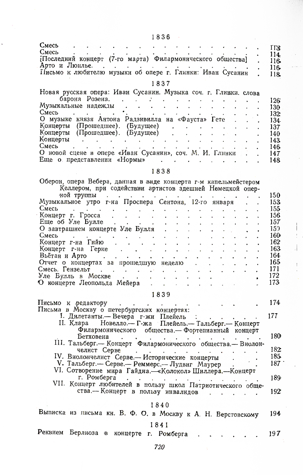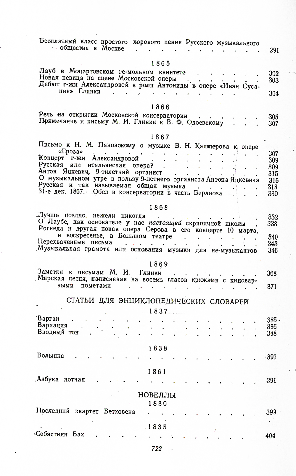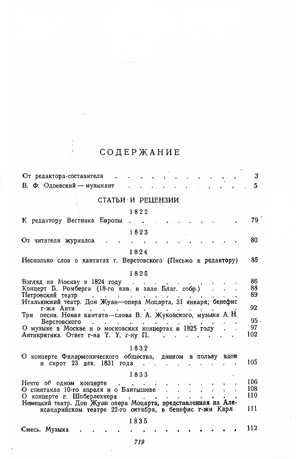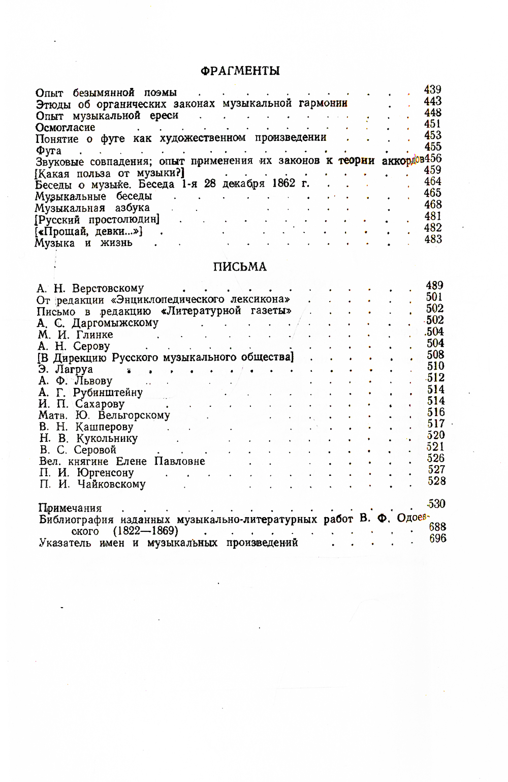 В настоящее издание вошли работы Одоевского о русской народной музыке, о творчестве русских и зарубежных композиторов и исполнителей, статьи о музыкальном образовании, заметки и рецензии о текущей концертной и театральной жизни Москвы и Петербурга, письма, речи, фрагменты незавершенных работ, а также новеллы "Последний квартет Бетховена" и "Себастиан Бах". (1956 Государственное музыкальное издательство)