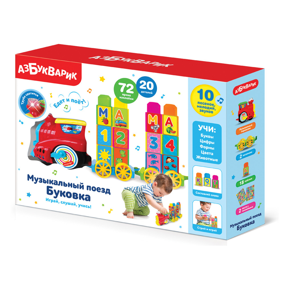 Музыкальный поезд Буковка - это уникальная развивающая игрушка «2 в 1»: музыкальный паровозик и обучающий конструктор. Включи паровозик - он поедет сам и будет петь песенки и издавать настоящие звуки паровоза! Цепляй вагончики - паровозик легко повезет их за собой! Хочешь покатать зверят? Посади их в вагончики - прикрепи нужные кубики. Строй из кубиков башни, фигуры, учи буквы, цифры, формы, цвета и животных. Составляй из букв слоги и слова, подбирай логические пары - с этим поездом-конструктором можно придумать более 10 обучающих игр! Каждый раз можно играть по-новому! На коробке есть рекомендации для родителей, в какие обучающие игры можно поиграть, используя эти развивающие кубики. Такие занятия способствуют всестороннему развитию ребенка: и физическому (за паровозиком нужно побегать!), и интеллектуальному (через обучающие игры), и музыкальному (малыш может подпевать песенки).