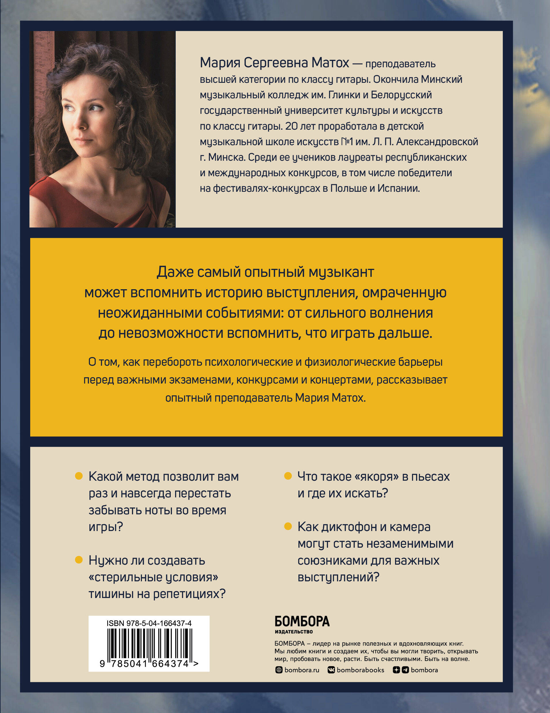 Свойство волноваться перед публичными выступлениями свойственно всем людям. На музыкантах к этим страхам добавляется ответственность не забыть свою партию и сыграть ее с нужными эмоциями и ритмом. О том, как перебороть психологические и физиологические барьеры перед важными экзаменами, конкурсами и концертами, рассказывает опытный преподаватель Мария Матох. • Какой метод позволит вам раз и навсегда перестать забывать ноты во время игры? • Что такое «якоря» в пьесах и где их искать? • Нужно ли создавать «стерильные условия» тишины на репетициях? • И как диктофон и камера могут стать незаменимым союзниками для важных выступлений? Каждый способ проиллюстрирован интересными примерами из личной педагогической практики автора. Также книга содержит множество наглядных иллюстраций для более образного донесения упражнений и практик. Мария Сергеевна Матох - преподаватель высшей категории по классу гитары. Окончила Минский музыкальный колледж им. Глинки и Белорусский государственный университет культуры и искусств по классу гитары. 20 лет проработала в детской музыкальной школе искусств № 1 им. Л. П. Александровской г. Минска. Среди ее учеников лауреаты республиканских и международных конкурсов, в том числе победители на фестивалях-конкурсах в Польше и Испании. Книга адресована преподавателям музыкальных школ, студий, начинающим исполнителям, а также всем, кому интересно узнать о скрытой от публики работе музыканта.| Издательство | ООО "Издательство "Эксмо" |
