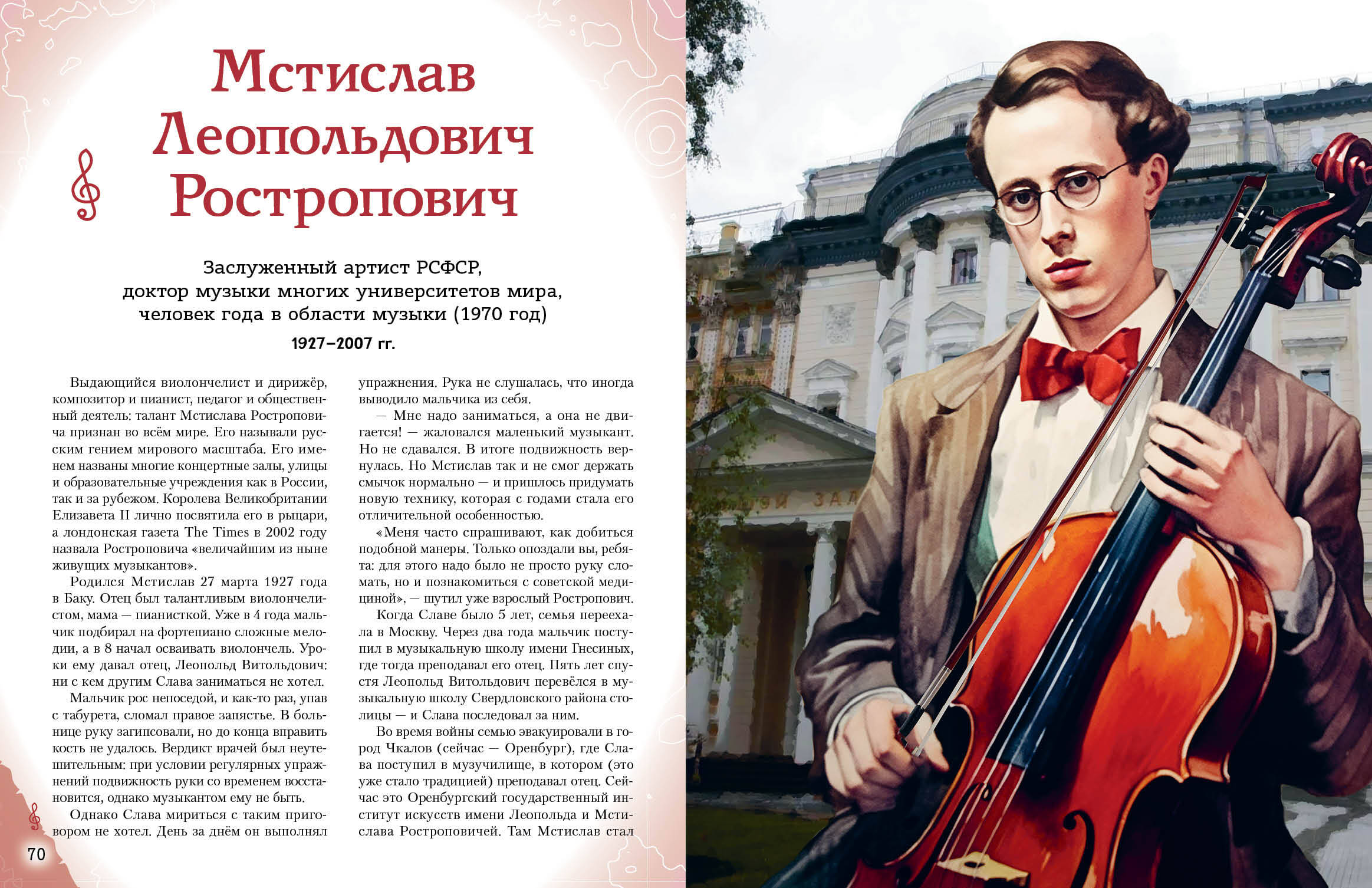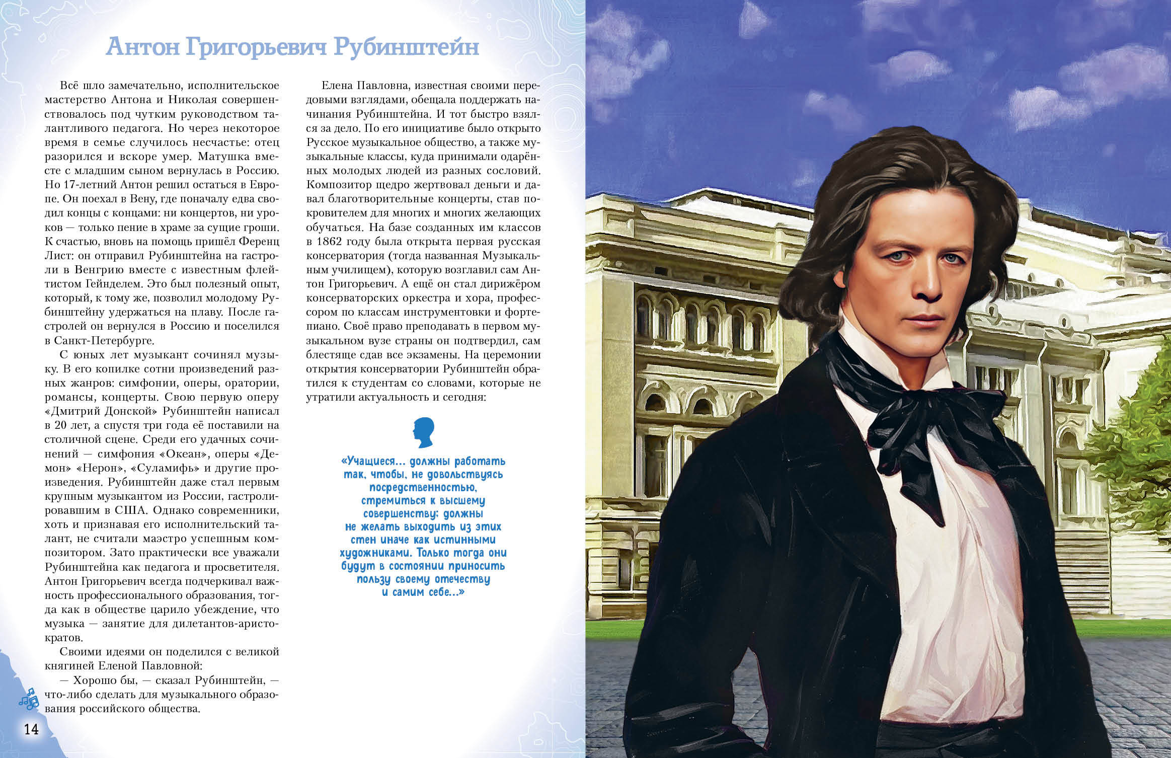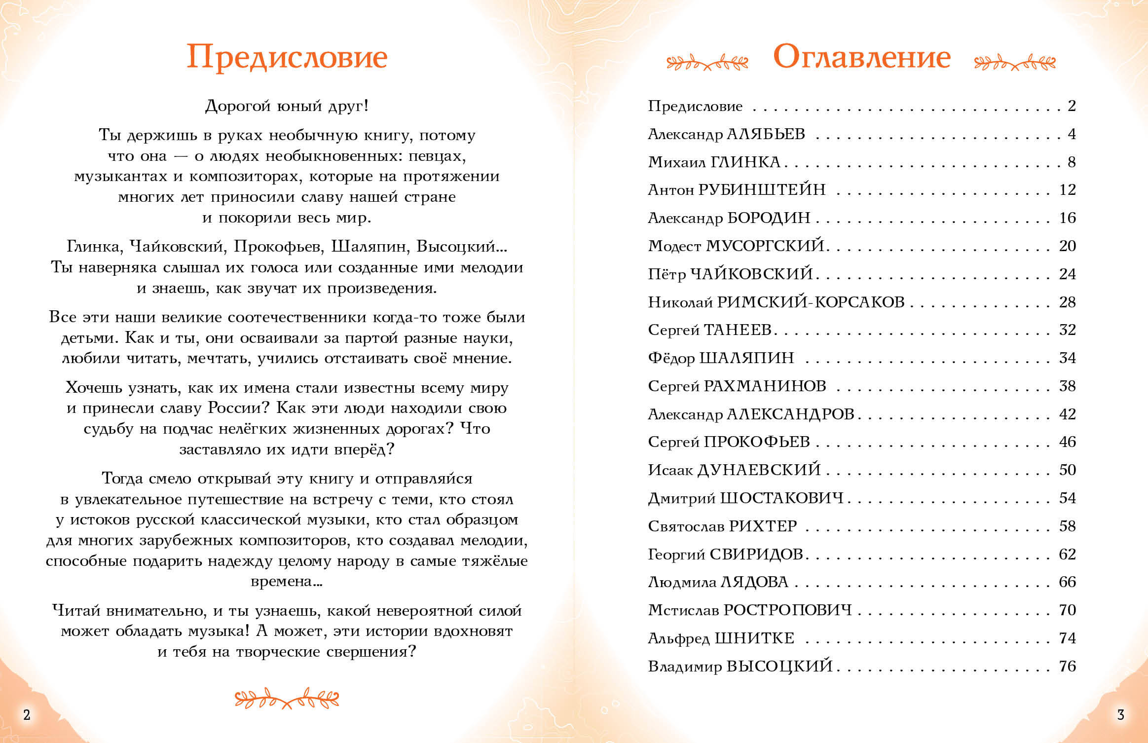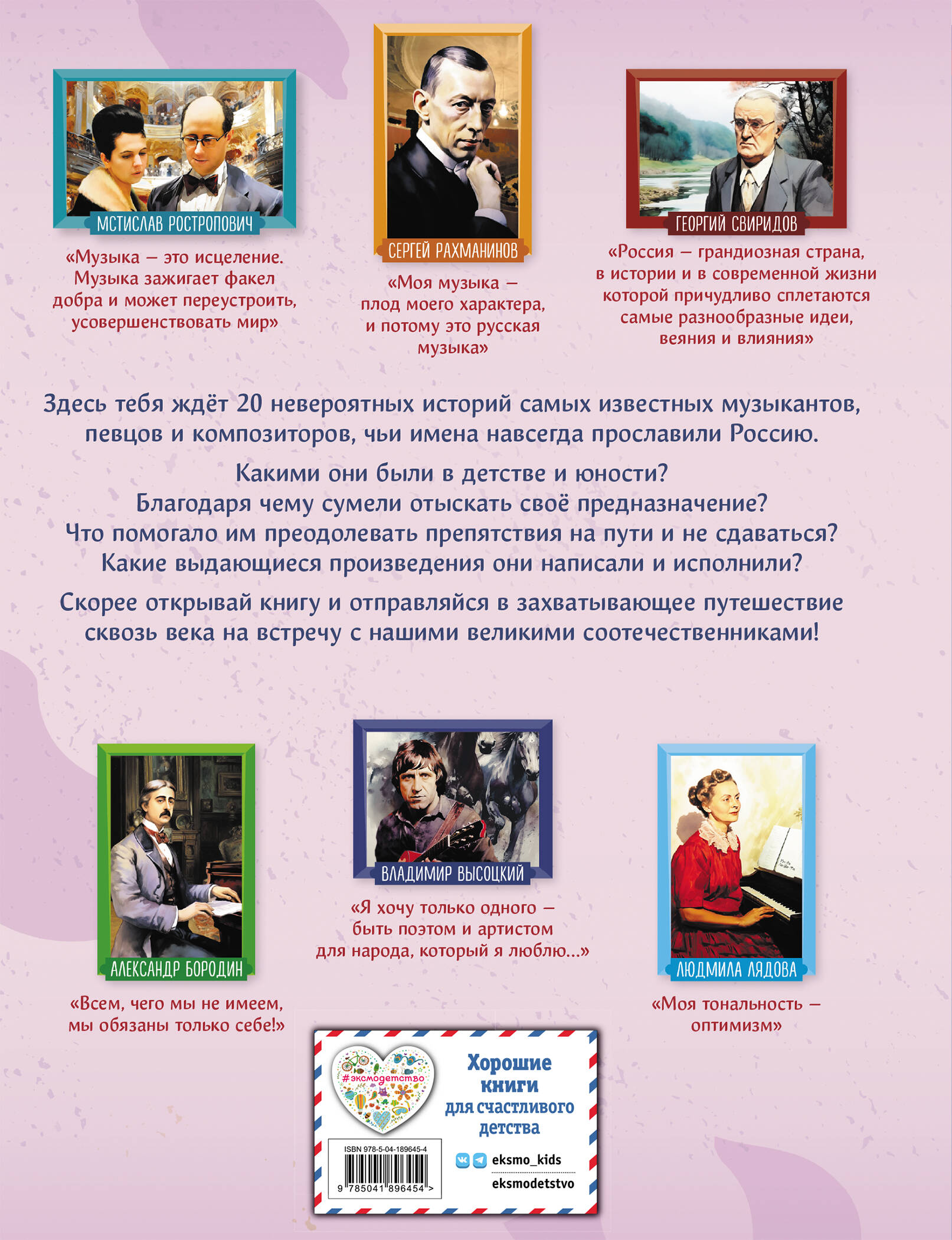 Эта книга патриотической серии «Великие люди великой страны» рассказывает о двадцати наших знаменитых соотечественниках - музыкантах, композиторах, музыковедах, певцах, чьи имена навсегда останутся в истории России. Кого называют «золотым голосом России»? При каких обстоятельствах была написана музыка к гимну нашей страны? Чьими стараниями были основаны первые русские консерватории? Захватывающие сюжеты в жанре нарративного нонфикшена, исторических «детективов» и «боевиков»! В каждом рассказе - вдохновляющая читателей на собственные свершения история успеха, невероятный пример силы воли и стойкости характера! Динамичные, запоминающиеся, современные, яркие иллюстрации созданы специально для этой книги! Издание предназначено для среднего школьного возраста, однако будет интересно и взрослым, а также станет неповторимым подарком по любому поводу для всех, кто любит Россию и гордится ею. Читайте всей семьёй и узнавайте всё самое интересное о великих людях нашей страны!| Издательство | ООО "Издательство "Эксмо" |