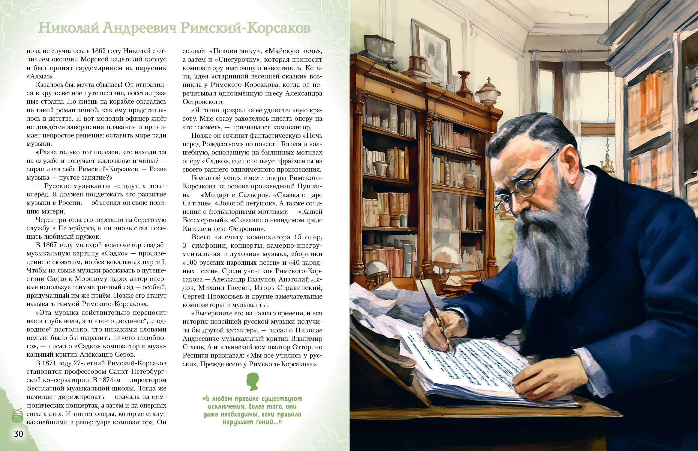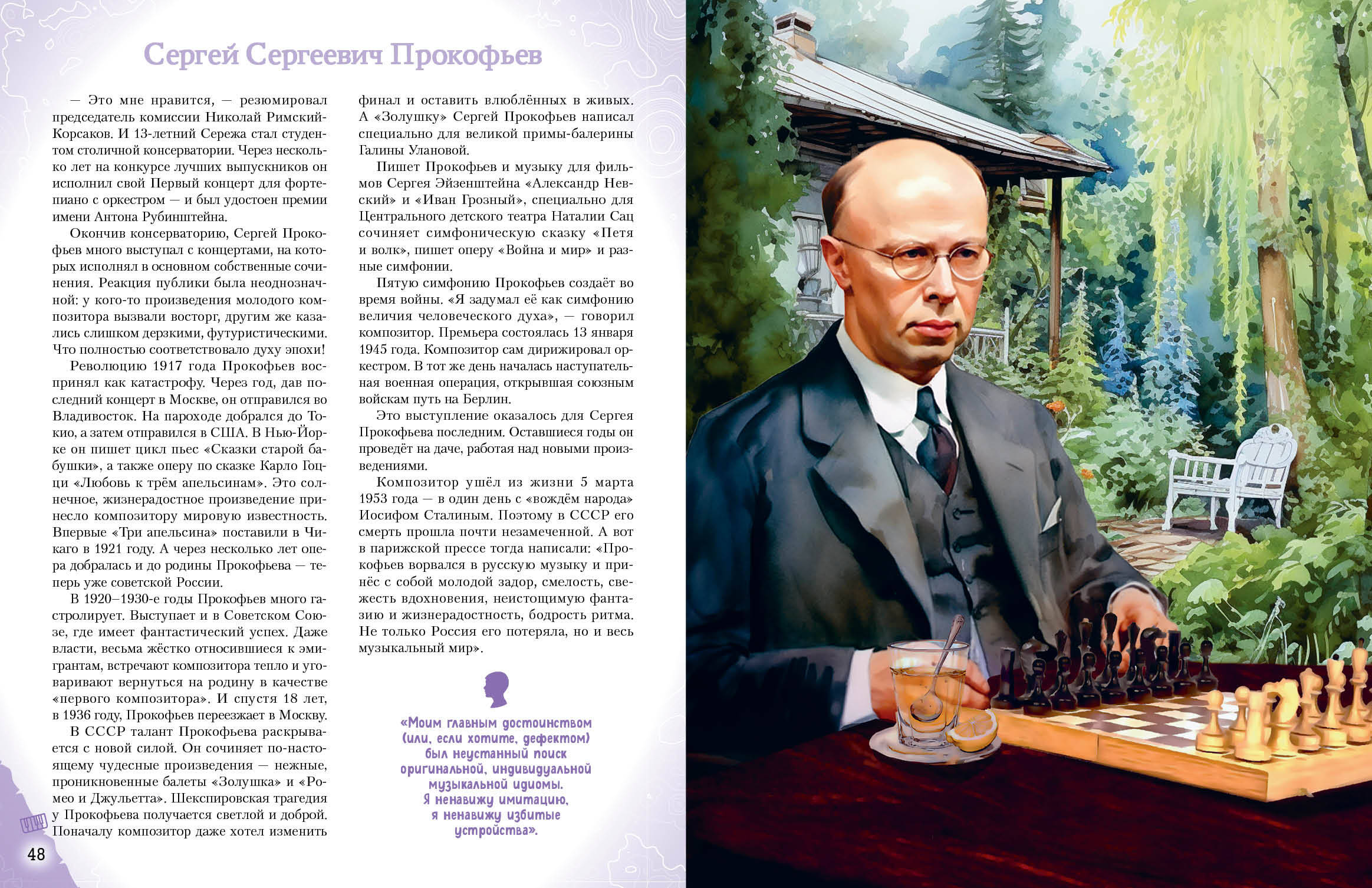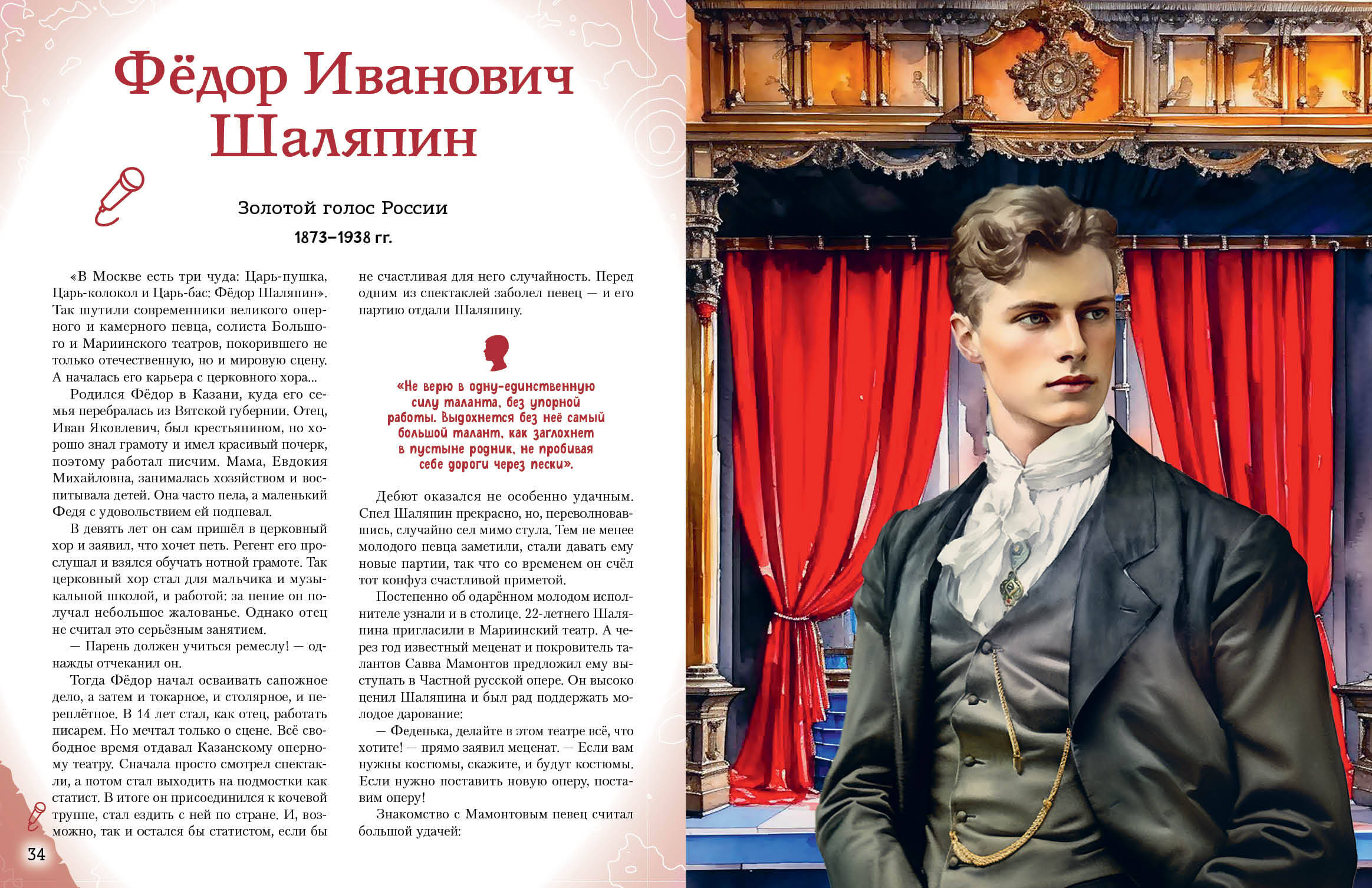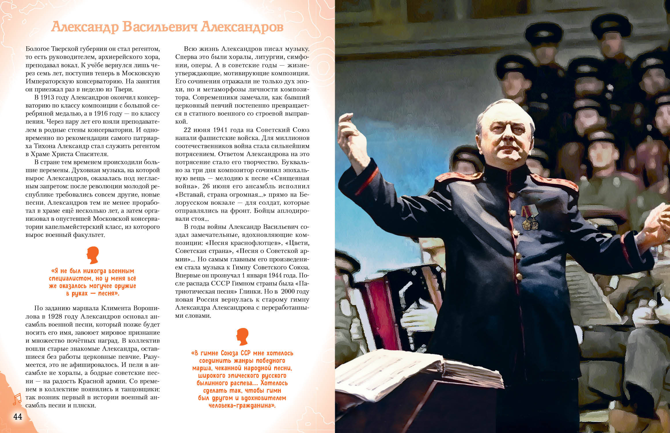 Эта книга патриотической серии «Великие люди великой страны» рассказывает о двадцати наших знаменитых соотечественниках - музыкантах, композиторах, музыковедах, певцах, чьи имена навсегда останутся в истории России. Кого называют «золотым голосом России»? При каких обстоятельствах была написана музыка к гимну нашей страны? Чьими стараниями были основаны первые русские консерватории? Захватывающие сюжеты в жанре нарративного нонфикшена, исторических «детективов» и «боевиков»! В каждом рассказе - вдохновляющая читателей на собственные свершения история успеха, невероятный пример силы воли и стойкости характера! Динамичные, запоминающиеся, современные, яркие иллюстрации созданы специально для этой книги! Издание предназначено для среднего школьного возраста, однако будет интересно и взрослым, а также станет неповторимым подарком по любому поводу для всех, кто любит Россию и гордится ею. Читайте всей семьёй и узнавайте всё самое интересное о великих людях нашей страны!| Издательство | ООО "Издательство "Эксмо" |
