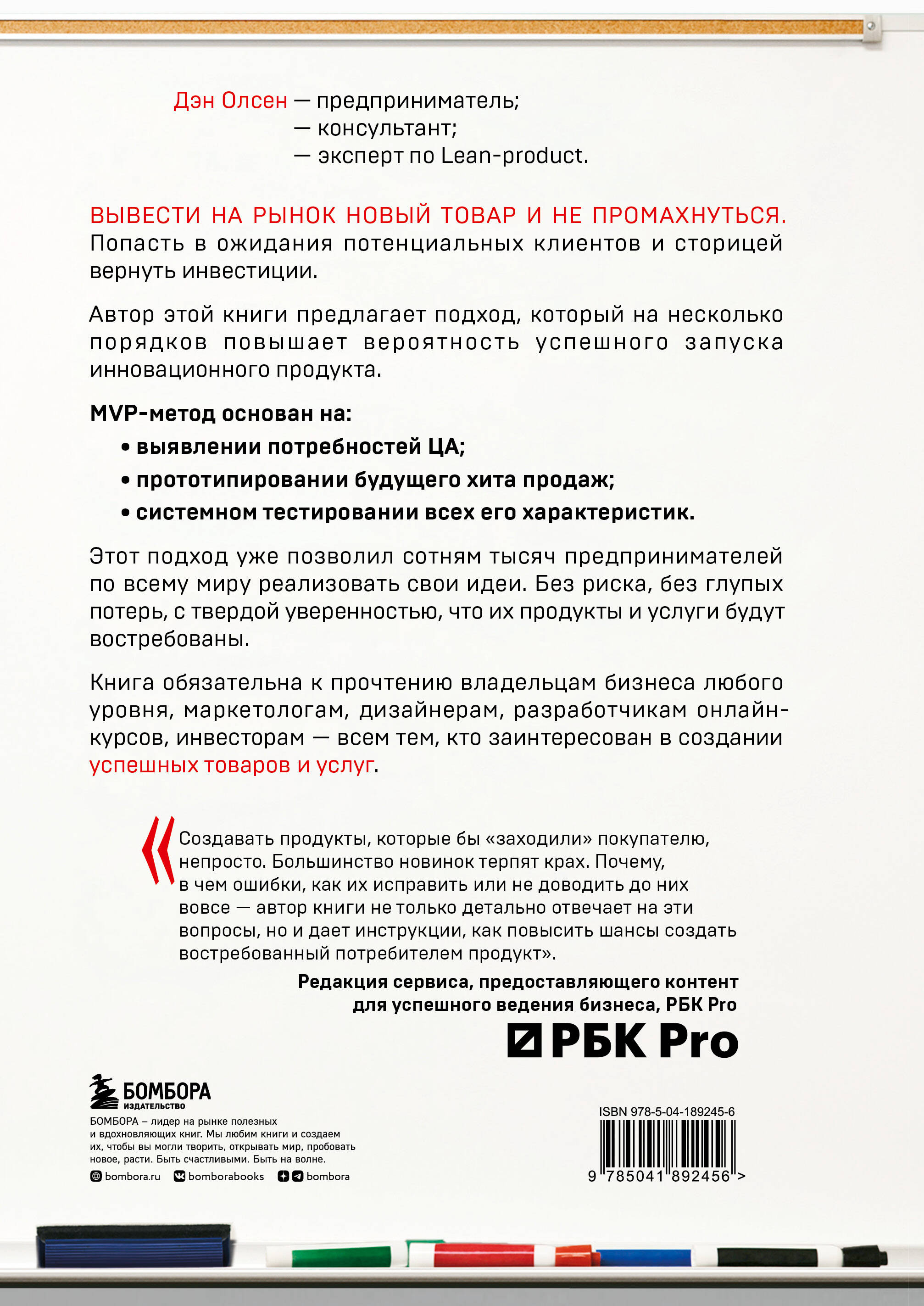 Как создать еще один айпад? На каждую известную историю успеха, будь то Apple или Google, приходится бесчисленное множество неудач. Тысячи компаний постоянно задаются вопросом - как делать продукты, которые понравятся покупателям, и сэкономить деньги при запуске их на рынок. Книга «MVP» как раз об этом. Перед вами четкое пошаговое руководство, из которого вы узнаете, как: - не только найти неудовлетворенные потребности, но и измерить степень их важности; - грамотно сегментировать целевую аудиторию; - использовать методы Agile - Scrum и Канбан; - сделать превосходный UX-дизайн; - сформировать ценностное предложение; - повысить потребительскую ценность с помощью улучшений; - создать прототип MVP и протестировать его на пользователях. Информация будет полезна всем - от дизайнеров до бизнесменов и инженеров, - каждому, кто хочет создать успешный рыночный продукт.