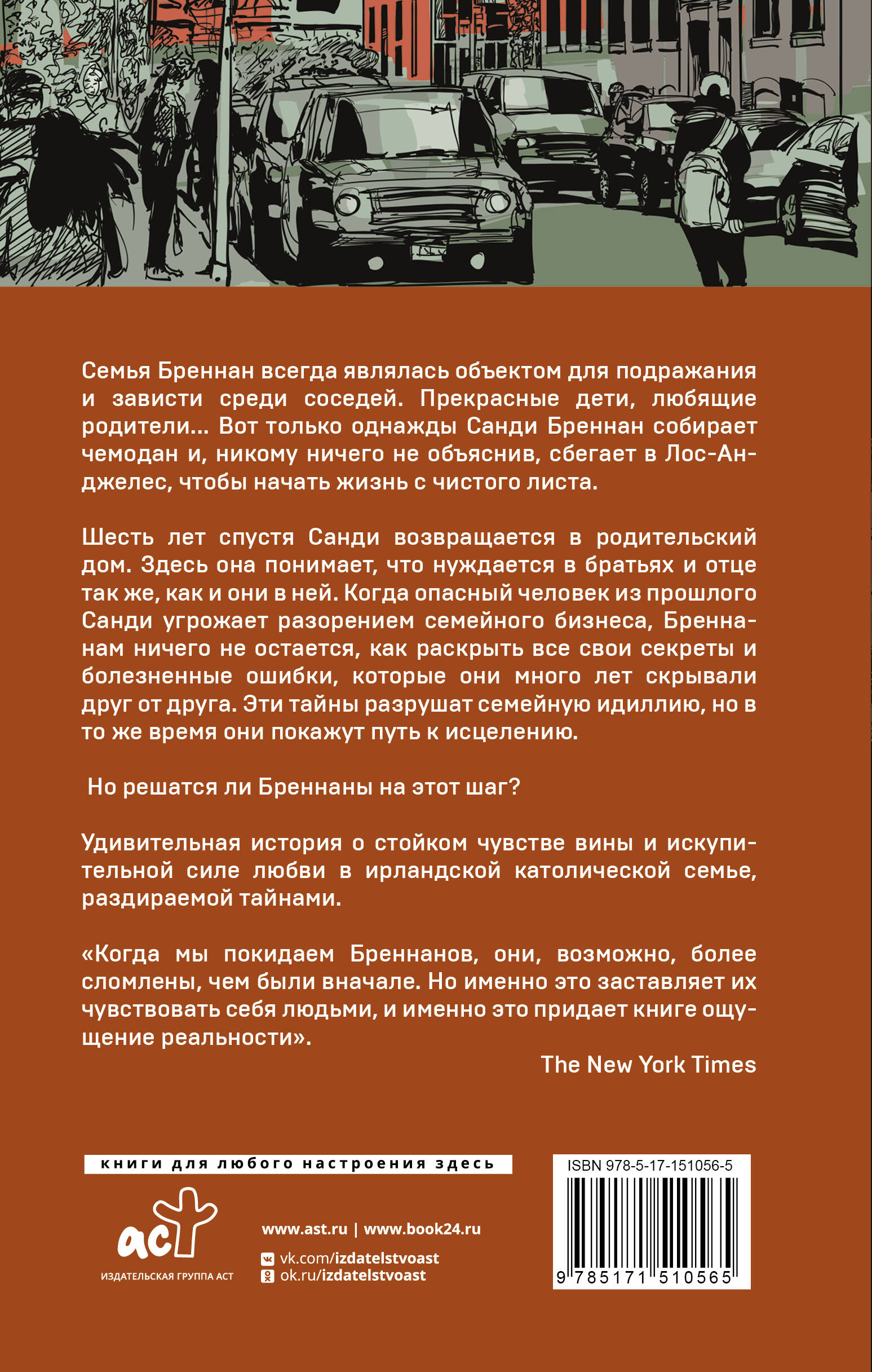 Семья Бреннан всегда являлась объектом для подражания и зависти среди соседей. Прекрасные дети, любящие родители... Вот только однажды Санди Бреннан собирает чемодан и, никому ничего не объяснив, сбегает в Лос-Анджелес, чтобы начать жизнь с чистого листа. Шесть лет спустя Санди возвращается в родительский дом. Здесь она понимает, что нуждается в братьях и отце так же, как и они в ней. Когда опасный человек из прошлого Санди угрожает разорением семейного бизнеса, Бреннанам ничего не остается, как раскрыть все свои секреты и болезненные ошибки, которые они много лет скрывали друг от друга. Эти тайны разрушат семейную идиллию, но в то же время они покажут путь к исцелению. Но решатся ли Бреннаны на этот шаг? Удивительная история о стойком чувстве вины и искупительной силе любви в ирландской католической семье, раздираемой тайнами.| Издательство | Издательство "АСТ" |