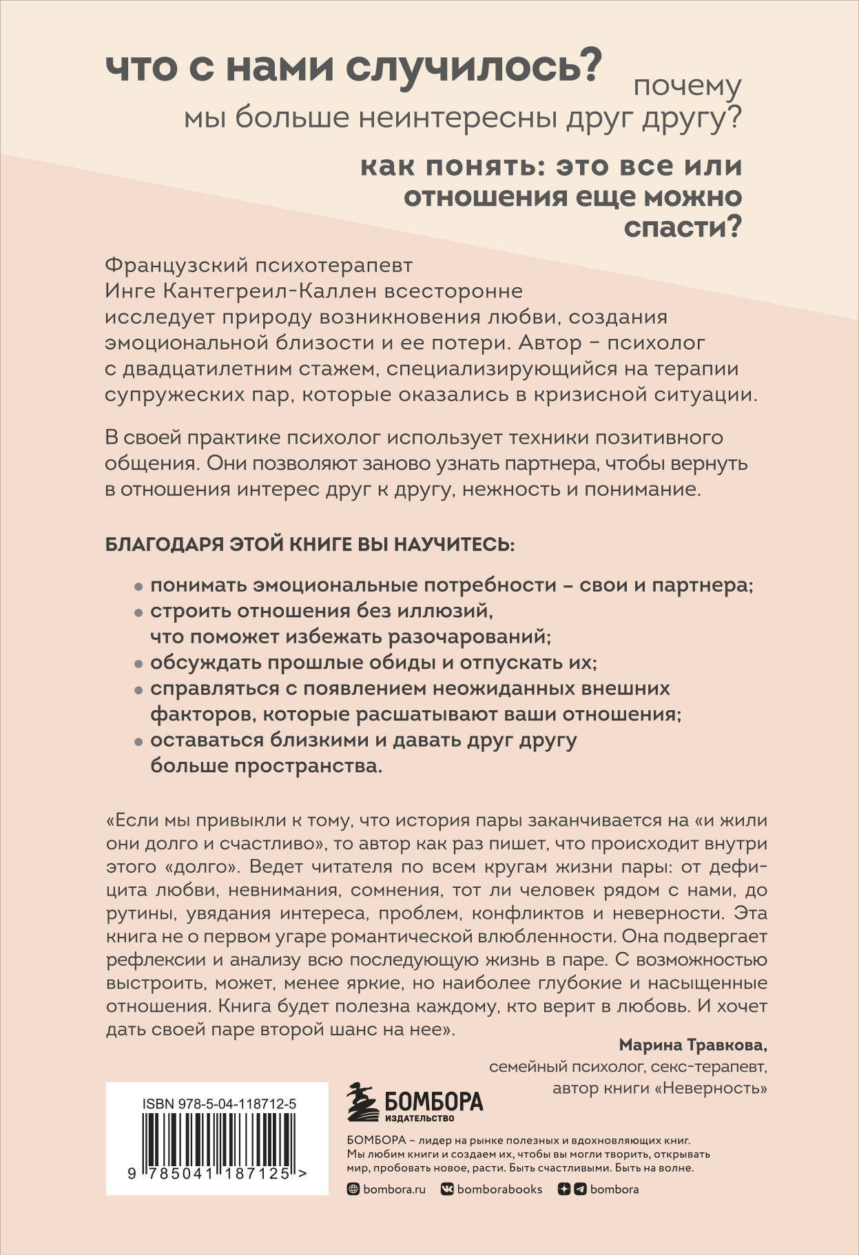 Что такое любовь? Действительно ли нам нужно всё или ничего? Какие эмоции определяют наш выбор? В кого нужно влюбиться, чтобы отношения были единственные и на всю жизнь? В эпоху сайтов знакомств и разовых встреч нам стало труднее ответить на эти вопросы. Любовь - сложный механизм, и для того, чтобы строить настоящие долгосрочные отношения, необходимо понять, как он работает. Доктор психологии Инге Кантегрей-Каллен много лет занимается психотерапией супружеских пар, которые оказались в кризисной ситуации. Рутина, обиды, разочарование, отстраненность, токсичность, проблемы в сексе - все это делает отношения более хрупкими. Мы меняемся, и вместе с нами меняется наша связь с партнером. Психотерапевт дает советы, как разрешать конфликты, общаться, ценить близкого человека и научиться прощать. Если вы решили не отказываться от отношений, а ухаживать за ними, эта книга для вас. ОТЗЫВЫ: «Если мы привыкли к тому, что история пары заканчивается на «и жили они долго и счастливо», то автор как раз пишет, что происходит внутри этого «долго». Ведет читателя по всем кругам жизни пары: от дефицитов в любви, невнимания, сомнения, тот ли человек рядом с нами, до рутины, увядания интереса, проблем, конфликтов и неверности. Эта книга не о первом угаре романтической влюбленности. Она подвергает рефлексии и анализу всю последующую жизнь в паре. С возможностью выстроить, может, менее яркие, но наиболее глубокие и насыщенные отношения. Книга будет полезна каждому, кто верит в любовь. И хочет дать своей паре второй шанс на нее». - Марина Травкова, семейный психолог, секс-терапевт, автор книги «Неверность»