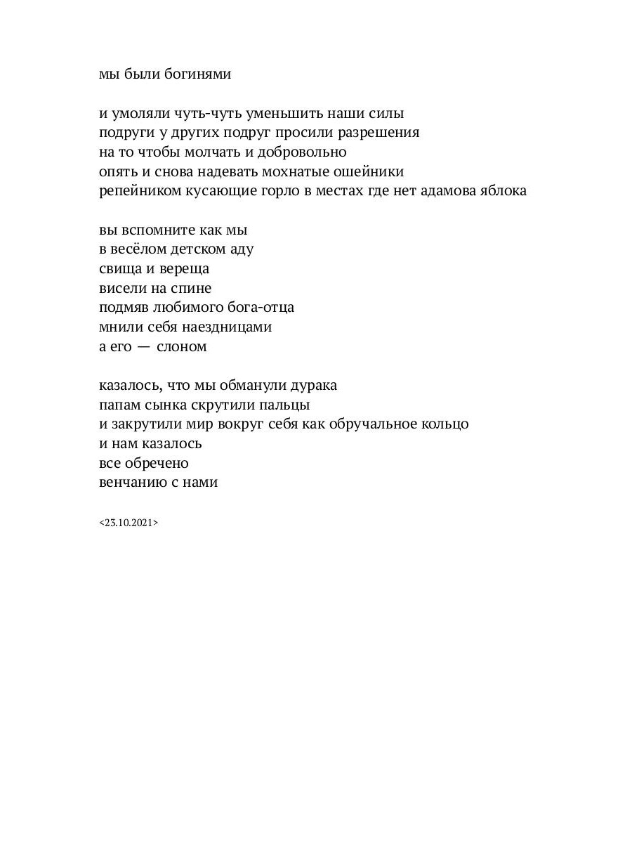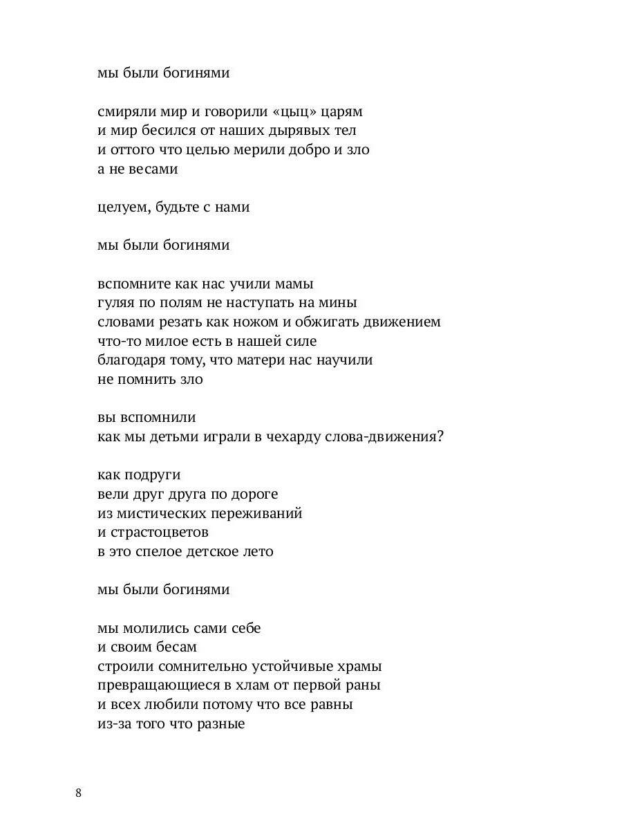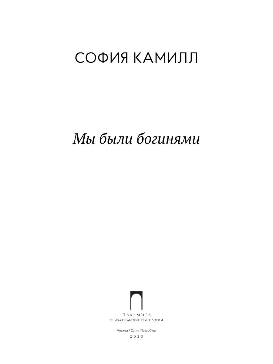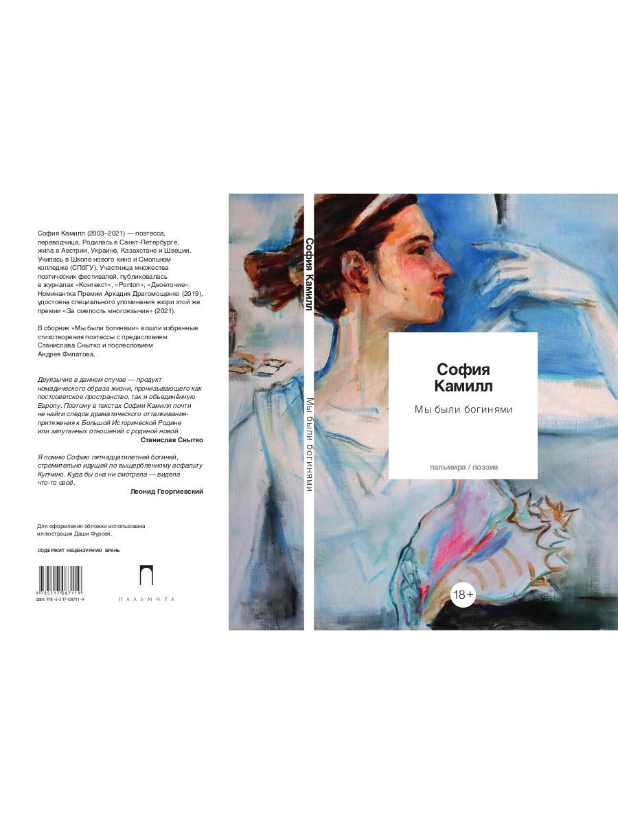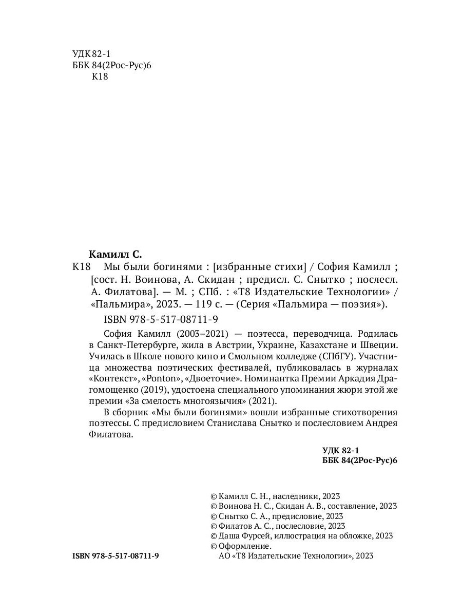 София Камилл (2003-2021) - поэтесса, переводчица. Родилась в Санкт-Петербурге, жила в Австрии, Украине, Казахстане и Швеции. Училась в Школе нового кино и Смольном колледже (СПбГУ). Участница множества поэтических фестивалей, публиковалась в журналах "Контекст", "Ponton", "Двоеточие". Номинантка Премии Аркадия Драгомощенко (2019), удостоена специального упоминания жюри этой же премии "За смелость многоязычия" (2021). В сборник "Мы были богинями" вошли избранные стихотворения поэтессы. С предисловием Станислава Снытко и послесловием Андрея Филатова.