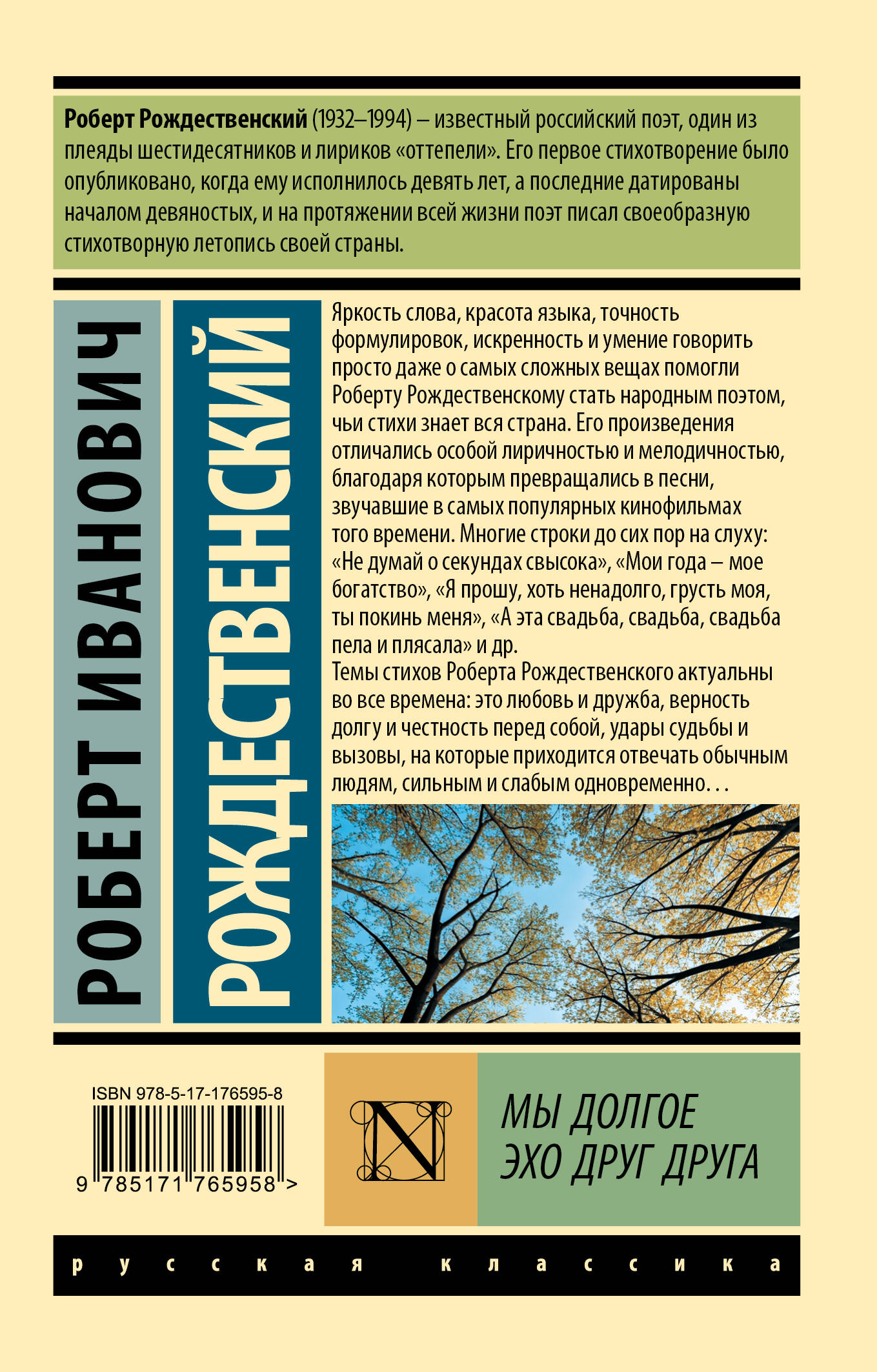 Роберт Рождественский (1932-1994) - известный российский поэт, один из плеяды шестидесятников и лириков «оттепели». Его первое стихотворение было опубликовано, когда ему исполнилось девять лет, а последние датированы началом девяностых, и на протяжении всей жизни поэт писал своеобразную стихотворную летопись своей страны. Яркость слова, красота языка, точность формулировок, искренность и умение говорить просто даже о самых сложных вещах помогли Роберту Рождественскому стать народным поэтом, чьи стихи знает вся страна. Его произведения отличались особой лиричностью и мелодичностью, благодаря которым превращались в песни, звучавшие в самых популярных кинофильмах того времени. Многие строки до сих пор на слуху: «Не думай о секундах свысока», «Мои года - мое богатство», «Я прошу, хоть ненадолго, грусть моя, ты покинь меня», «А эта свадьба, свадьба, свадьба пела и плясала» и др. Темы стихов Роберта Рождественского актуальны во все времена: это любовь и дружба, верность долгу и честность перед собой, удары судьбы и вызовы, на которые приходится отвечать обычным людям, сильным и слабым одновременно…| Издательство | Издательство "АСТ" |
