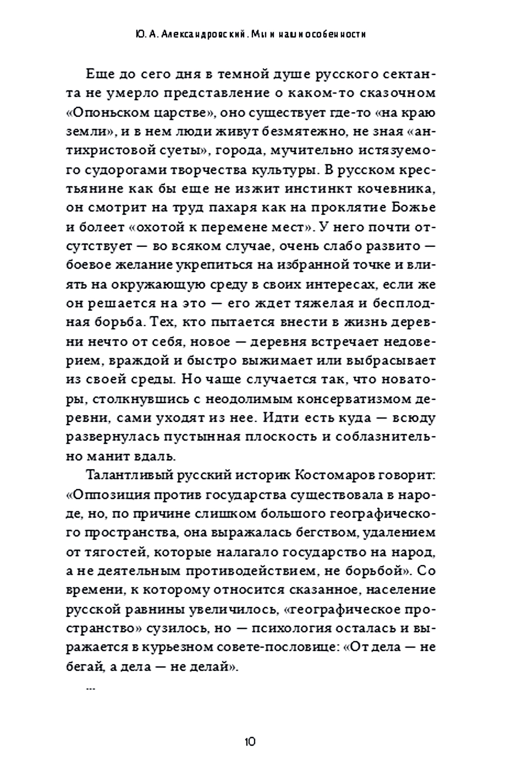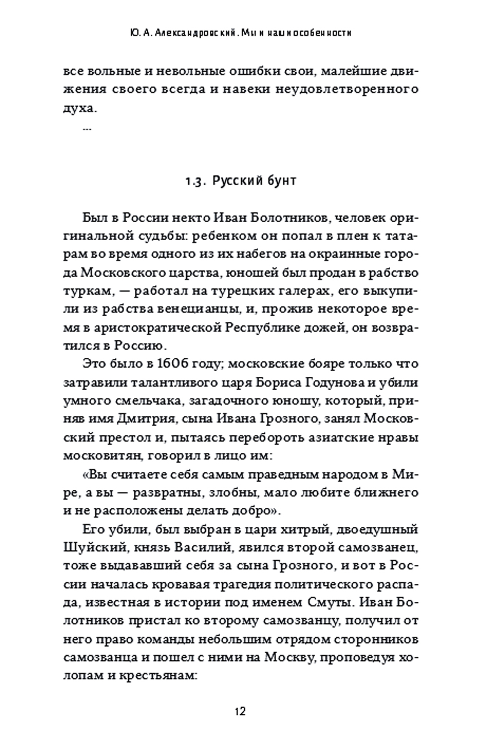 Существует ли национальный характер? В чем проявляются особенности русского человека? Эти и связанные с ними вопросы, основываясь на собственных наблюдениях и на высказываниях известных людей, рассматривает врач-психиатр и ученый, член-корреспондент РАН профессор Ю. А. Александровский. В первой части приведены выдержки из заметок А.М. Горького «О русском крестьянстве», повести Ю.С. Семенова «Смерть Петра», дневников посла Франции в России в начале прошлого века М. Палеолога, очерков «Характер русский» академика Т.Б. Дмитриевой и лекции физиолога, академика И.П. Павлова «О русском уме», рассказывающих о психологических особенностях русских людей, которые сохраняются на протяжении столетий и формируют национальные особенности. Эти материалы из малодоступных изданий позволяют увидеть в нас самих как характерные особенности предшественников, так и приобретенное со временем своеобразие. К части материалов сделаны небольшие комментарии составителя. Вторая часть книги написана Ю.А. Александровским после знакомства с разнообразными суждениями авторов первых глав. Его взгляд отражает современное понимание особенностей характера человека и их влияние на жизненный путь каждого из нас. Для широкого круга читателей, интересующихся историей и вопросами формирования личностных особенностей человека и его поведения.