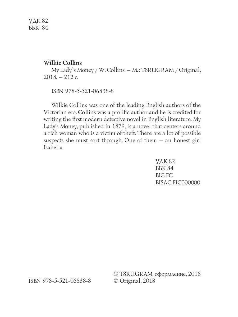 Wilkie Collins was one of the leading English authors of the Victorian era, Collins was a prolific author and he is credited for writing the first modern detective novel in English literature. My Lady's Money, published in 1879, is a novel that centers around a rich woman who is a victim of theft. There are a lot of possible suspects she must sort through. One of them - an honest girl Isabella| Издательство | Т8 RUGRAM |