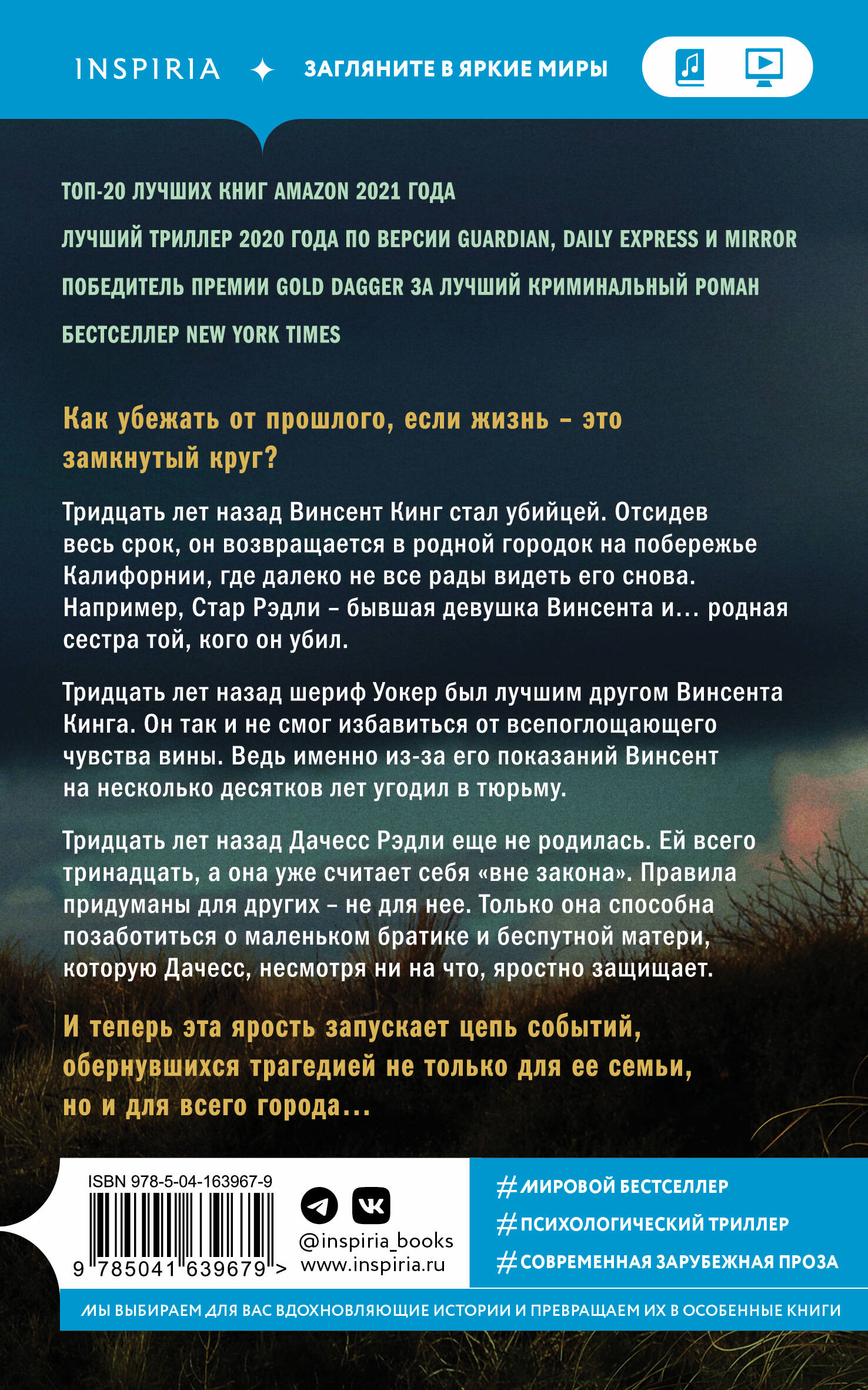 ТОП-20 ЛУЧШИХ КНИГ AMAZON 2021 ГОДА. ЛУЧШИЙ ТРИЛЛЕР 2020 ГОДА ПО ВЕРСИИ GUARDIAN, DAILY EXPRESS И MIRROR. ПОБЕДИТЕЛЬ ПРЕМИИ GOLD DAGGER ЗА ЛУЧШИЙ КРИМИНАЛЬНЫЙ РОМАН. БЕСТСЕЛЛЕР NEW YORK TIMES. Как убежать от прошлого, если жизнь - это замкнутый круг? Тридцать лет назад Винсент Кинг стал убийцей. Отсидев весь срок, он возвращается в родной городок на побережье Калифорнии, где далеко не все рады видеть его снова. Например, Стар Рэдли - бывшая девушка Винсента и… родная сестра той, кого он убил. Тридцать лет назад шериф Уокер был лучшим другом Винсента Кинга. Он так и не смог избавиться от всепоглощающего чувства вины. Ведь именно из-за его показаний Винсент на несколько десятков лет угодил в тюрьму. Тридцать лет назад Дачесс Рэдли еще не родилась. Ей всего тринадцать, а она уже считает себя «вне закона». Правила придуманы для других - не для нее. Только она способна позаботиться о маленьком братике и беспутной матери, которую Дачесс, несмотря ни на что, яростно защищает. И теперь эта ярость запускает цепь событий, обернувшихся трагедией не только для ее семьи, но и для всего города… Роман, который все называют шедевром. Роман об убийстве и возмездии. О тайнах и лжи. О том, на что готовы пойти люди, защищая тех, кого любят. О нерушимой связи между друзьями, семьей и возлюбленными. О добре и зле, и о нас - проживающих всю свою жизнь где-то между… -------------------------------------------------- «Этот великолепный роман моментально стал классикой… После того, как вы перевернете его последнюю страницу, вам будет очень сложно - как было и мне - описать этот опыт… Роман отчетливо американский - и в то же самое время абсолютно общемировой». - А. Дж. Финн «Этот роман - тот самый прорыв, о котором мечтает каждый издатель. Богатый как в смысле сюжета, так и характеров, полный конфликтами и напряжением, юмором и трагедийностью, острым писательским чутьем… Добавьте сюда самый убедительный юный персонаж, ничего подобного которому не встречалось последние 10 лет, - и получите наполненную глубоким смыслом историю, наслаждение от первой страницы до последней. Великолепная работа, мистер Уитакер!» - Джон Харт «Мне очень понравилась эта книга - и захватывающий сюжет, и изящный стиль. Но самое главное в ней - это характеры, особенно молодая Дачесс. Свирепая, отважная и очень уязвимая, она спрыгивает к вам со страниц как живая. И Уок… Какое удачное имя! Инспектор полиции в своем собственном неумолимом путешествии… Это книга, которую нужно читать и перечитывать - и нахваливать автора». - Луиза Пенни «Законченная и очень трогательная история преступления, наказания, любви и искупления». - Guardian «Эпическая драма и безусловный шедевр. Вряд ли мы прочтем нечто подобное в ближайшее время». - Mirror| Издательство | Эксмо |