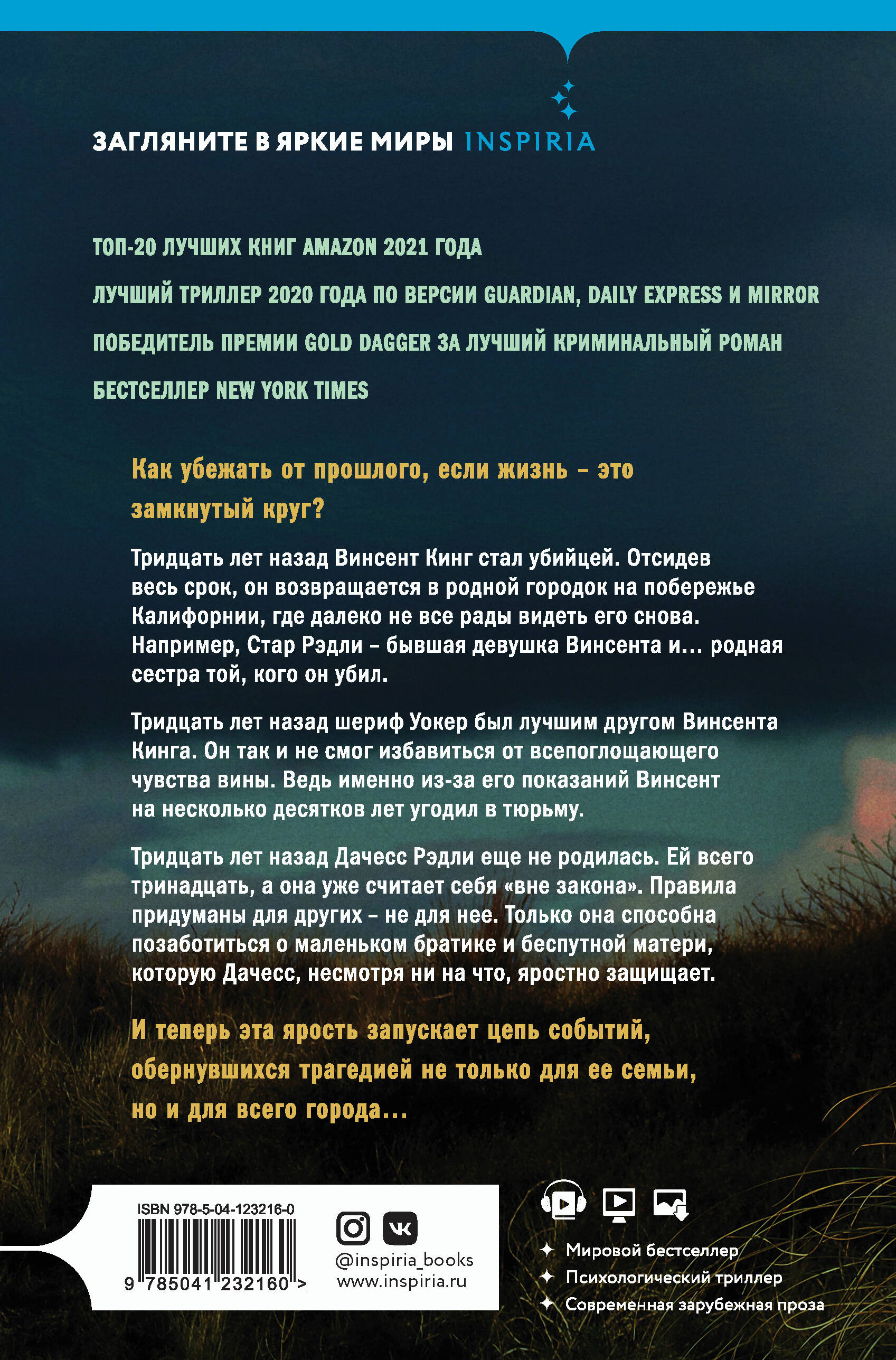 ТОП-20 ЛУЧШИХ КНИГ AMAZON 2021 ГОДА. ЛУЧШИЙ ТРИЛЛЕР 2020 ГОДА ПО ВЕРСИИ GUARDIAN, DAILY EXPRESS И MIRROR. ПОБЕДИТЕЛЬ ПРЕМИИ GOLD DAGGER ЗА ЛУЧШИЙ КРИМИНАЛЬНЫЙ РОМАН. БЕСТСЕЛЛЕР NEW YORK TIMES. Как убежать от прошлого, если жизнь - это замкнутый круг? Тридцать лет назад Винсент Кинг стал убийцей. Отсидев весь срок, он возвращается в родной городок на побережье Калифорнии, где далеко не все рады видеть его снова. Например, Стар Рэдли - бывшая девушка Винсента и… родная сестра той, кого он убил. Тридцать лет назад шериф Уокер был лучшим другом Винсента Кинга. Он так и не смог избавиться от всепоглощающего чувства вины. Ведь именно из-за его показаний Винсент на несколько десятков лет угодил в тюрьму. Тридцать лет назад Дачесс Рэдли еще не родилась. Ей всего тринадцать, а она уже считает себя «вне закона». Правила придуманы для других - не для нее. Только она способна позаботиться о маленьком братике и беспутной матери, которую Дачесс, несмотря ни на что, яростно защищает. И теперь эта ярость запускает цепь событий, обернувшихся трагедией не только для ее семьи, но и для всего города… Роман, который все называют шедевром. Роман об убийстве и возмездии. О тайнах и лжи. О том, на что готовы пойти люди, защищая тех, кого любят. О нерушимой связи между друзьями, семьей и возлюбленными. О добре и зле, и о нас - проживающих всю свою жизнь где-то между… -------------------------------------------------- «Этот великолепный роман моментально стал классикой… После того, как вы перевернете его последнюю страницу, вам будет очень сложно - как было и мне - описать этот опыт… Роман отчетливо американский - и в то же самое время абсолютно общемировой». - А. Дж. Финн «Этот роман - тот самый прорыв, о котором мечтает каждый издатель. Богатый как в смысле сюжета, так и характеров, полный конфликтами и напряжением, юмором и трагедийностью, острым писательским чутьем… Добавьте сюда самый убедительный юный персонаж, ничего подобного которому не встречалось последние 10 лет, - и получите наполненную глубоким смыслом историю, наслаждение от первой страницы до последней. Великолепная работа, мистер Уитакер!» - Джон Харт «Мне очень понравилась эта книга - и захватывающий сюжет, и изящный стиль. Но самое главное в ней - это характеры, особенно молодая Дачесс. Свирепая, отважная и очень уязвимая, она спрыгивает к вам со страниц как живая. И Уок… Какое удачное имя! Инспектор полиции в своем собственном неумолимом путешествии… Это книга, которую нужно читать и перечитывать - и нахваливать автора». - Луиза Пенни «Законченная и очень трогательная история преступления, наказания, любви и искупления». - Guardian «Эпическая драма и безусловный шедевр. Вряд ли мы прочтем нечто подобное в ближайшее время». - Mirror| Издательство | ООО "Издательство "Эксмо" |